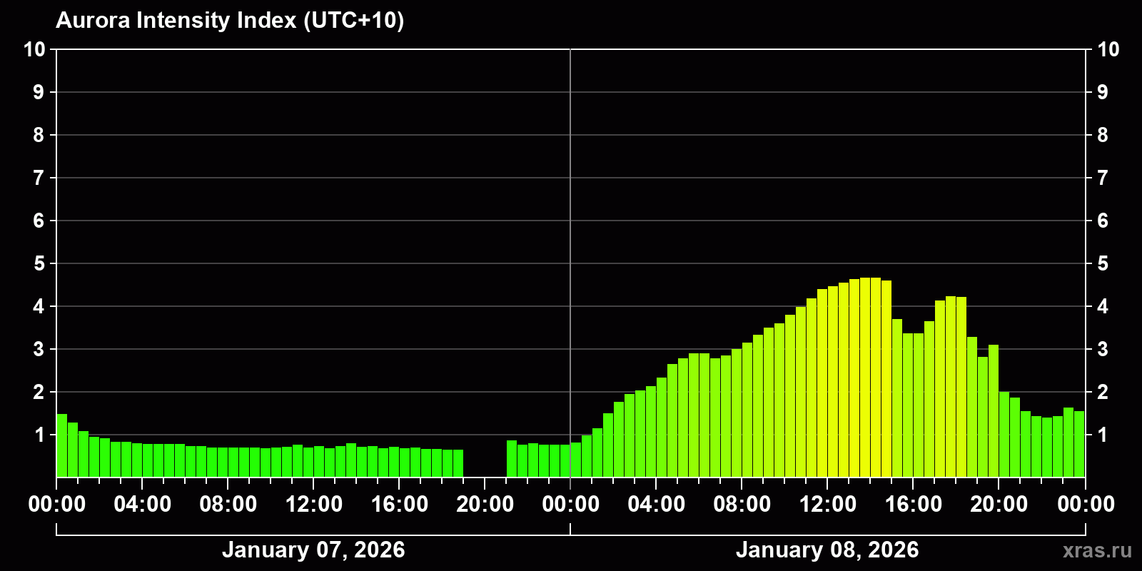 Changes in the auroral intensity index from 2026-01-07 to 2026-01-08 local time