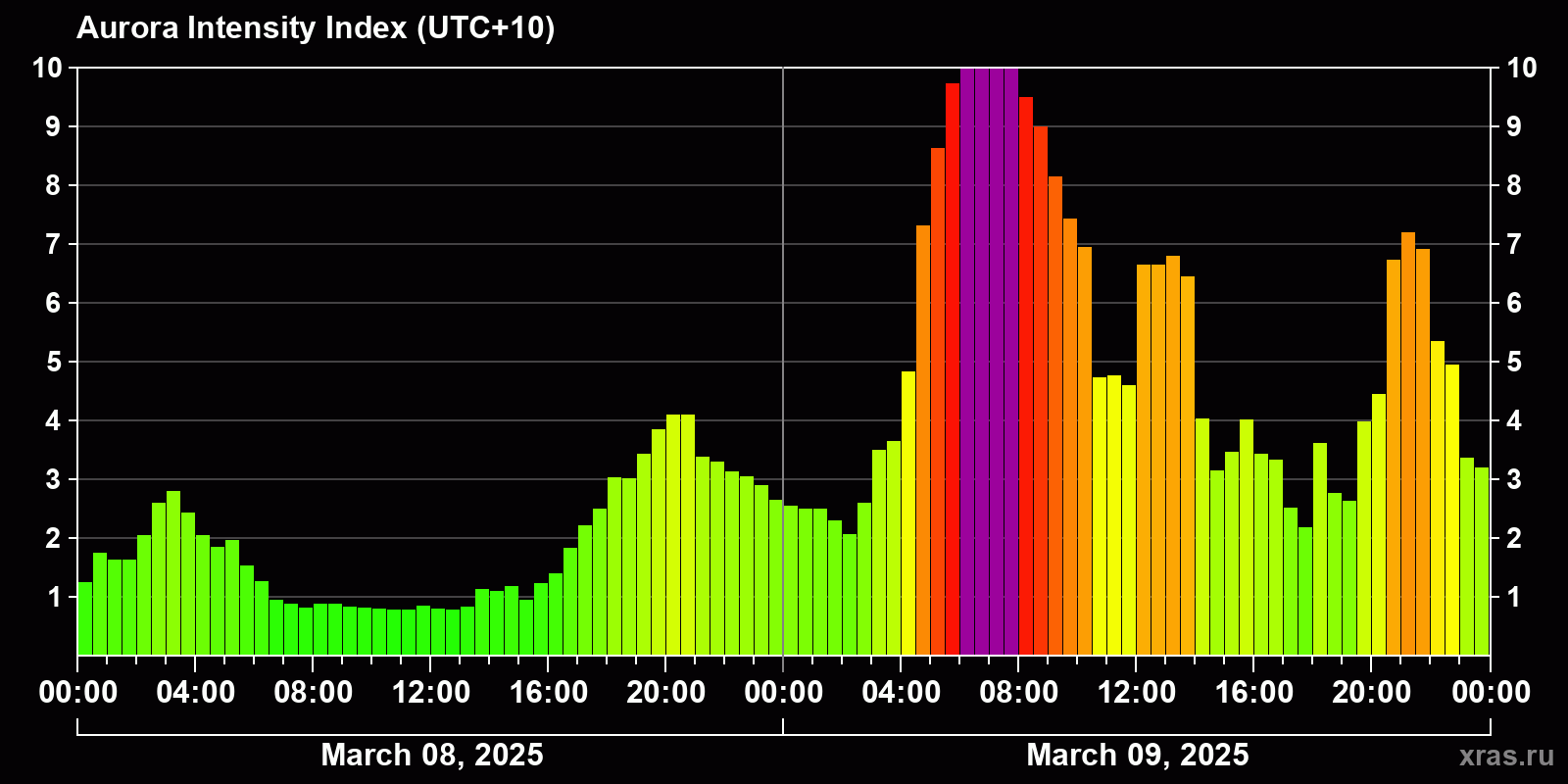 Changes in the auroral intensity index from 2025-03-08 to 2025-03-09 local time