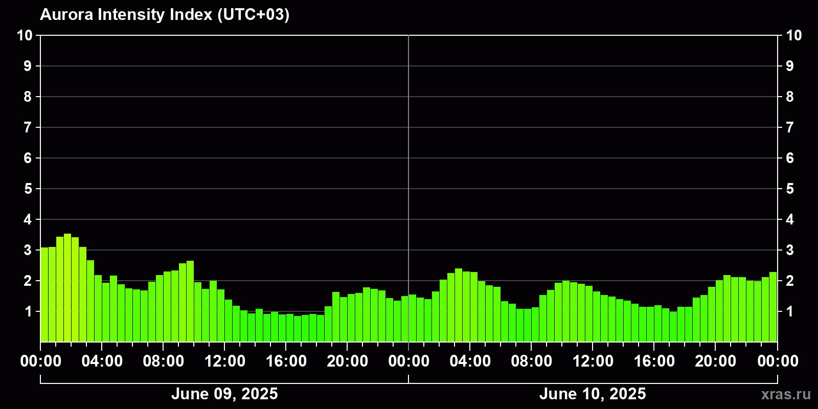 Auroral intensity index and the theoretically possible latitude of observations for nighttime in the Estern Hemisphere as of 2025-06-10 23:47 (end of day) local time