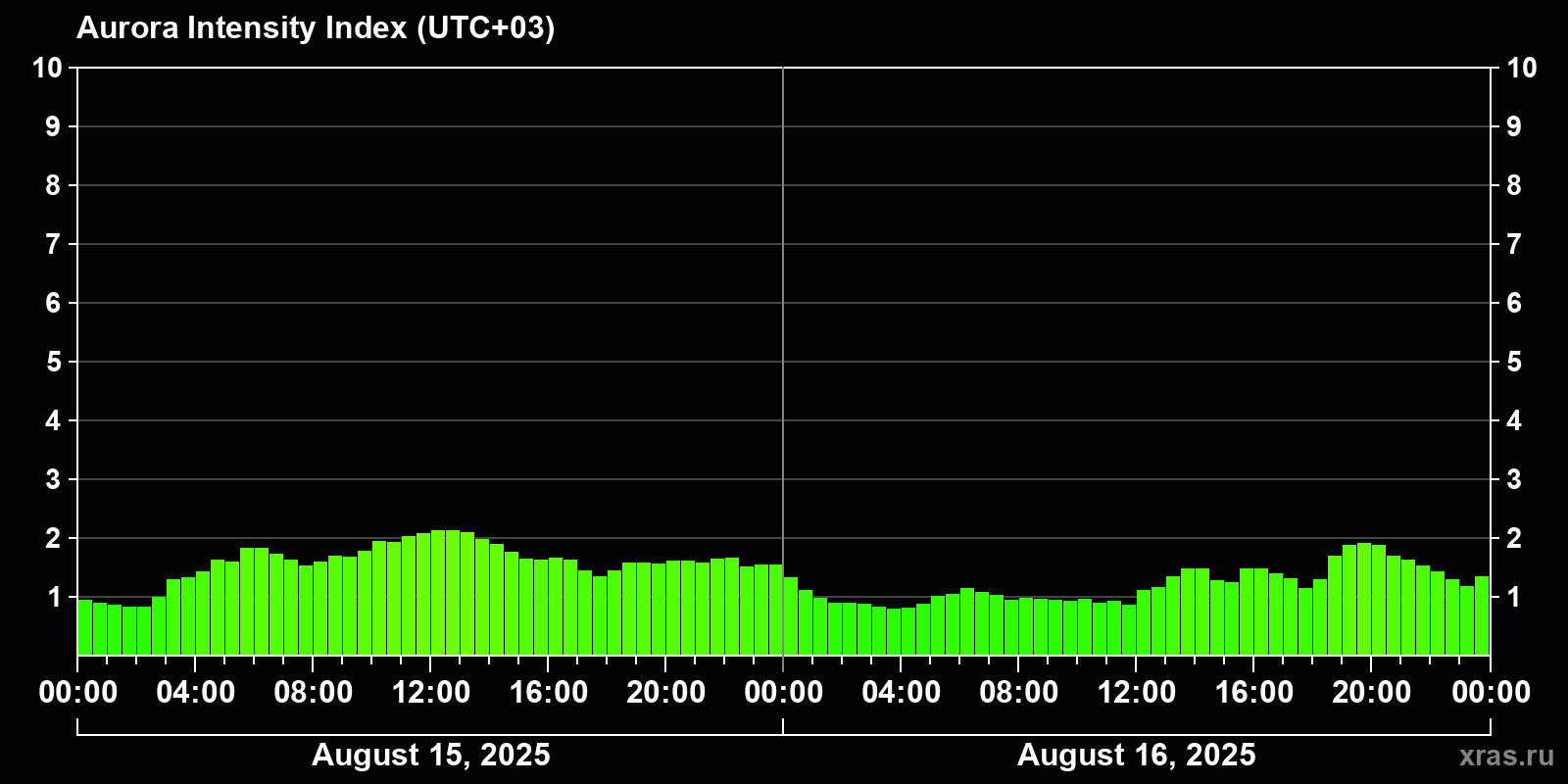 Auroral intensity index and the theoretically possible latitude of observations for nighttime in the Estern Hemisphere as of 2025-08-16 23:59 (end of day) local time