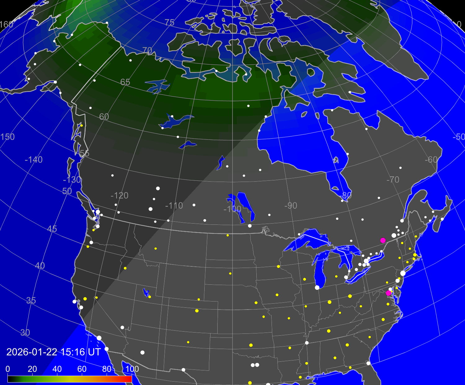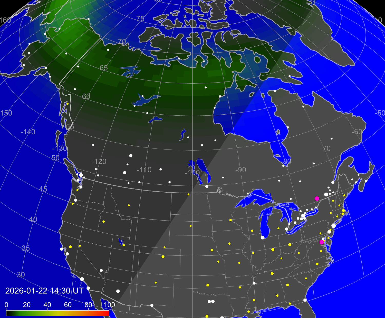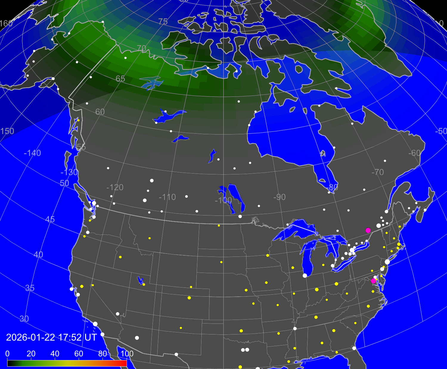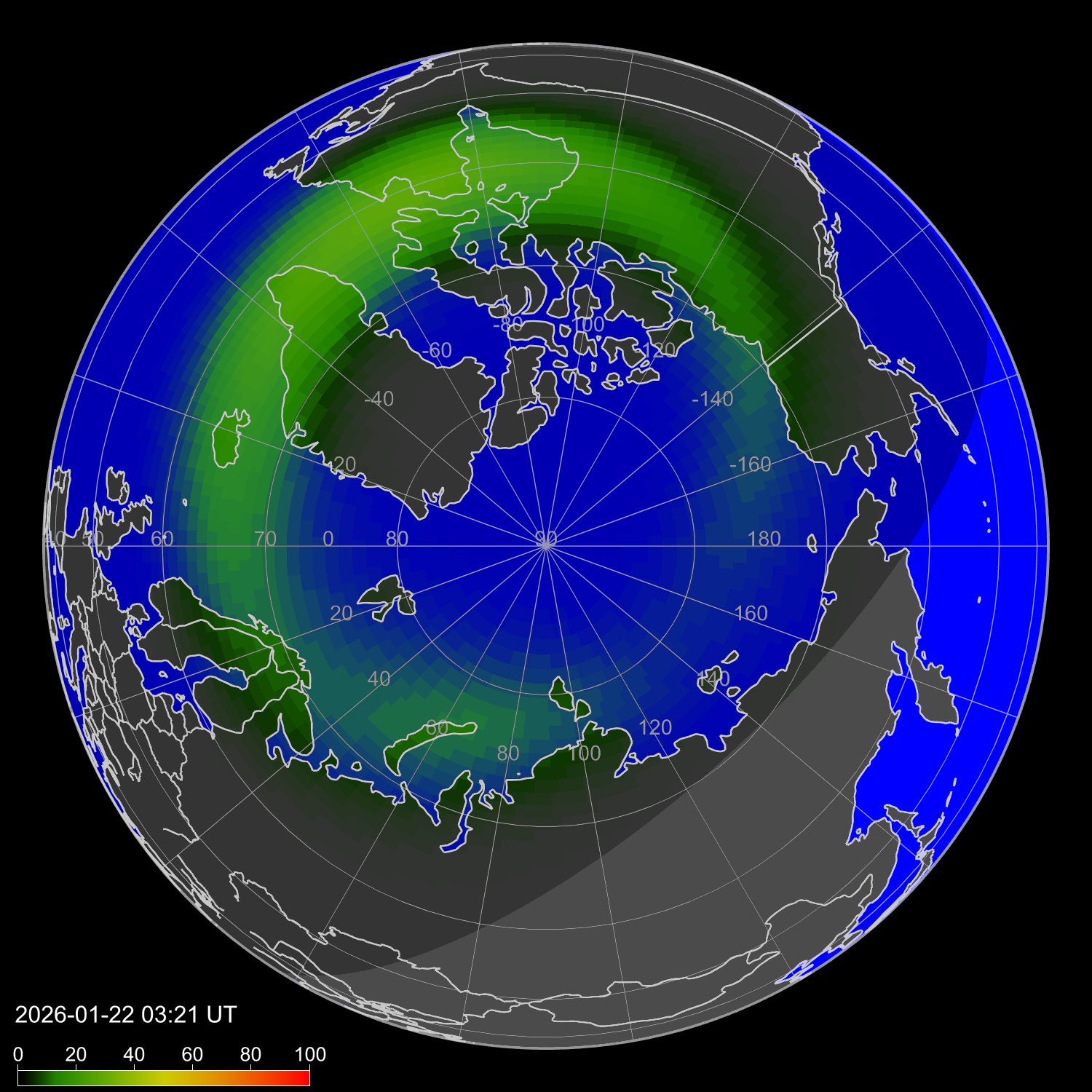 Индекс интенсивности полярных сияний и теоретически возможная широта наблюдений для ночного времени в западном полушарии