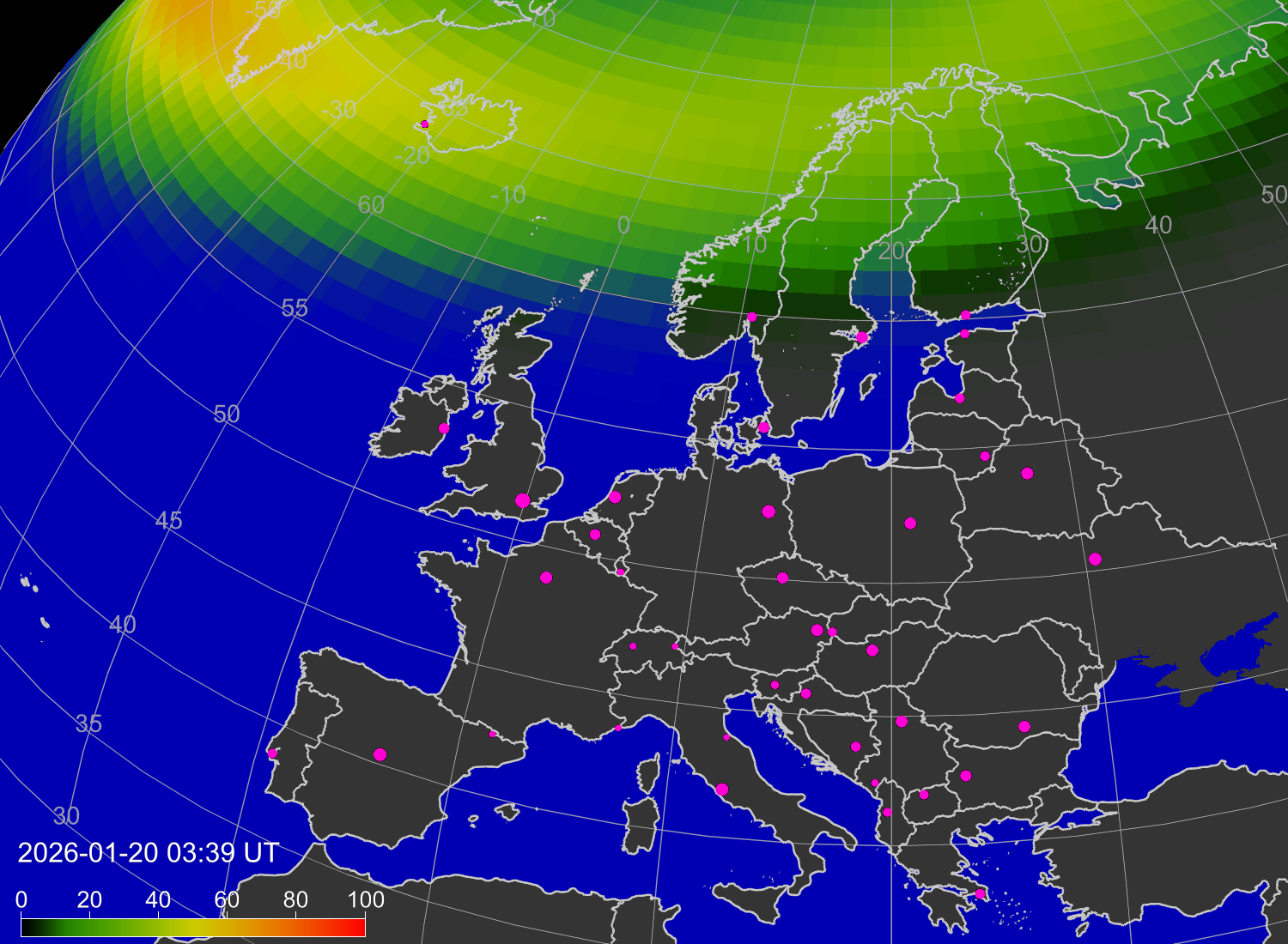Индекс интенсивности полярных сияний и теоретически возможная широта наблюдений для ночного времени в восточном полушарии