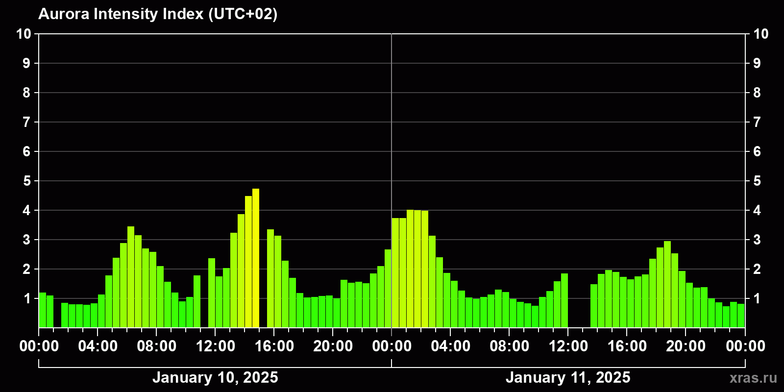 Changes in the auroral intensity index from 2025-01-10 to 2025-01-11 local time