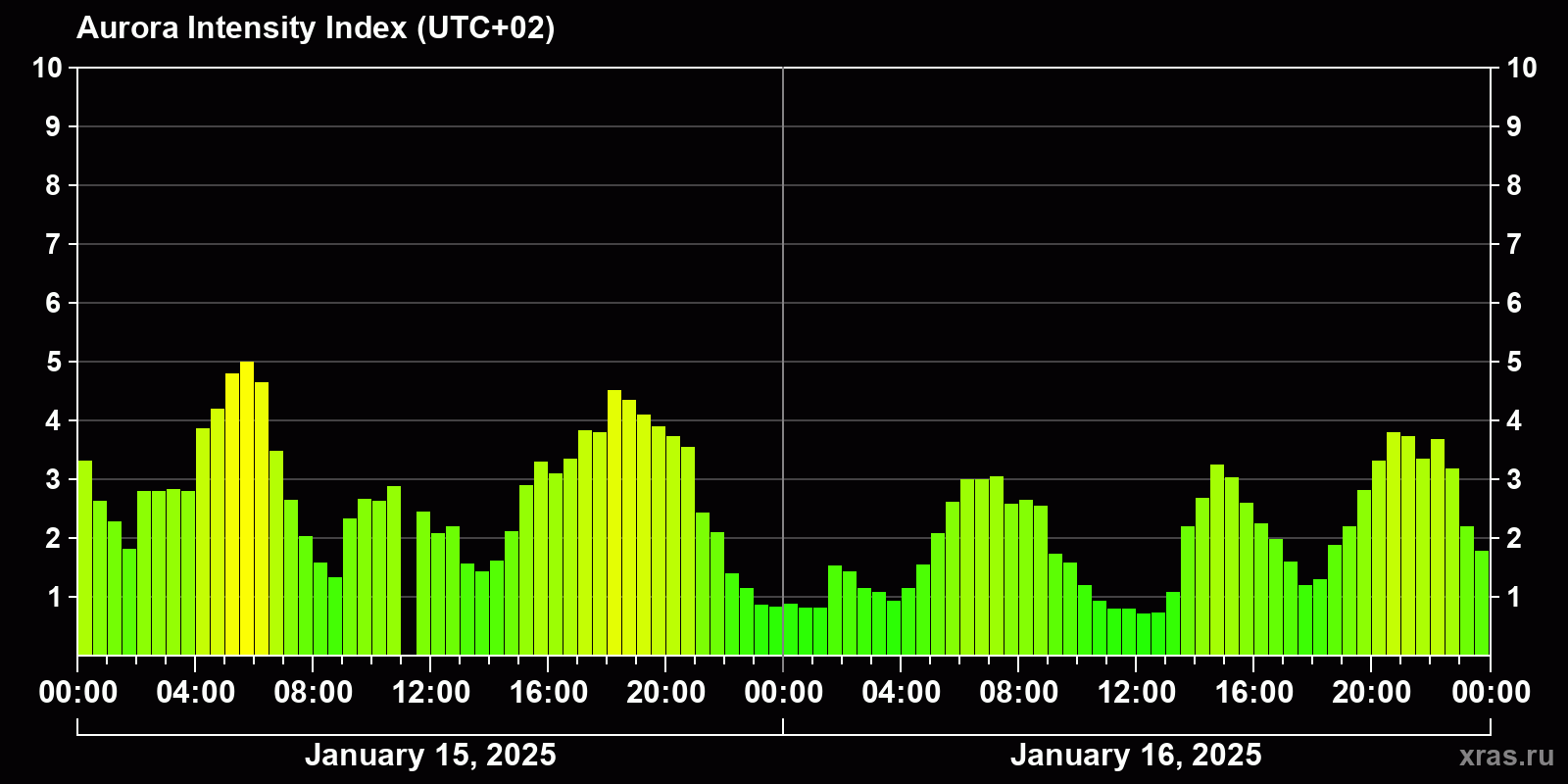 Auroral intensity index and the theoretically possible latitude of observations for nighttime in the Estern Hemisphere as of 2025-01-16 23:48 (end of day) local time