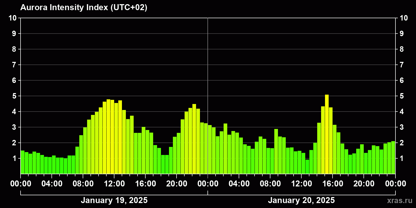 Auroral intensity index and the theoretically possible latitude of observations for nighttime in the Estern Hemisphere as of 2025-01-20 23:46 (end of day) local time