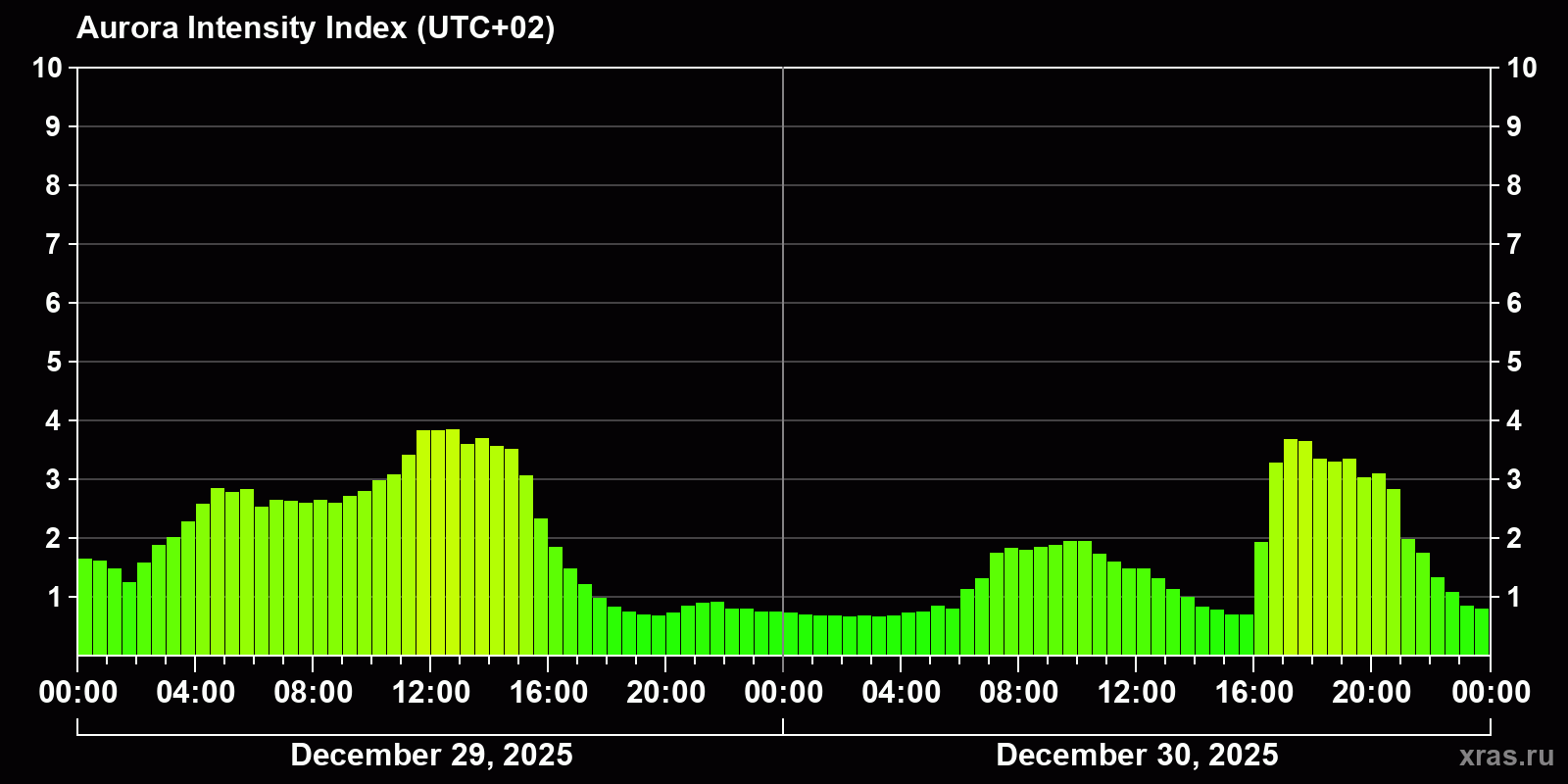 Auroral intensity index and the theoretically possible latitude of observations for nighttime in the Estern Hemisphere as of 2025-12-30 23:50 (end of day) local time