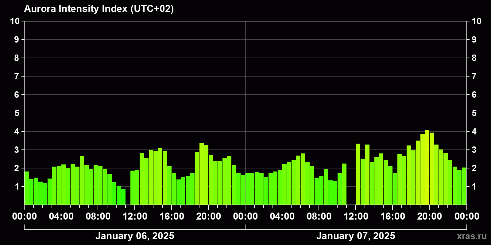 Changes in the auroral intensity index from 2025-01-06 to 2025-01-07 local time