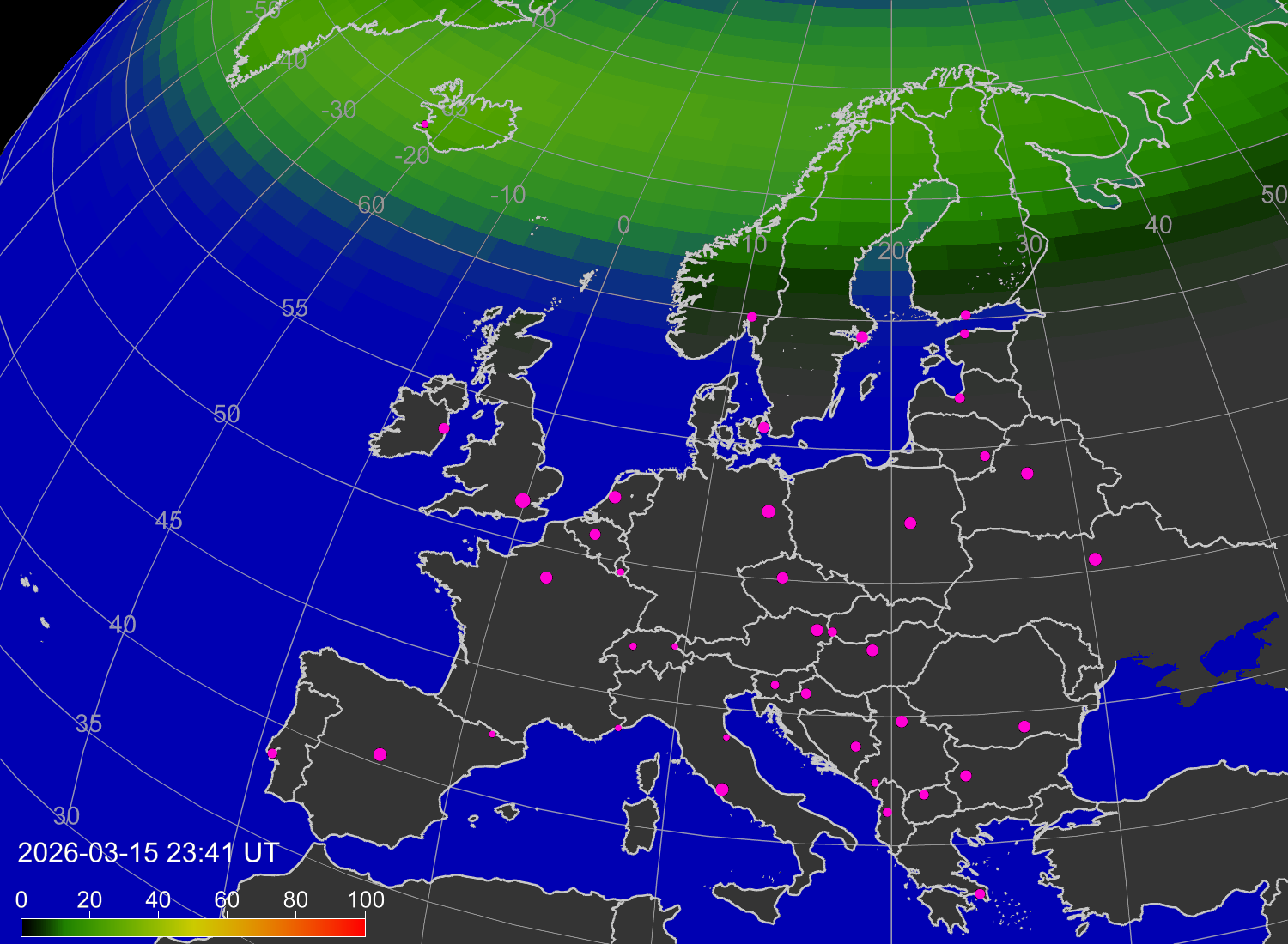 Вероятность полярных сияний в городах Европы