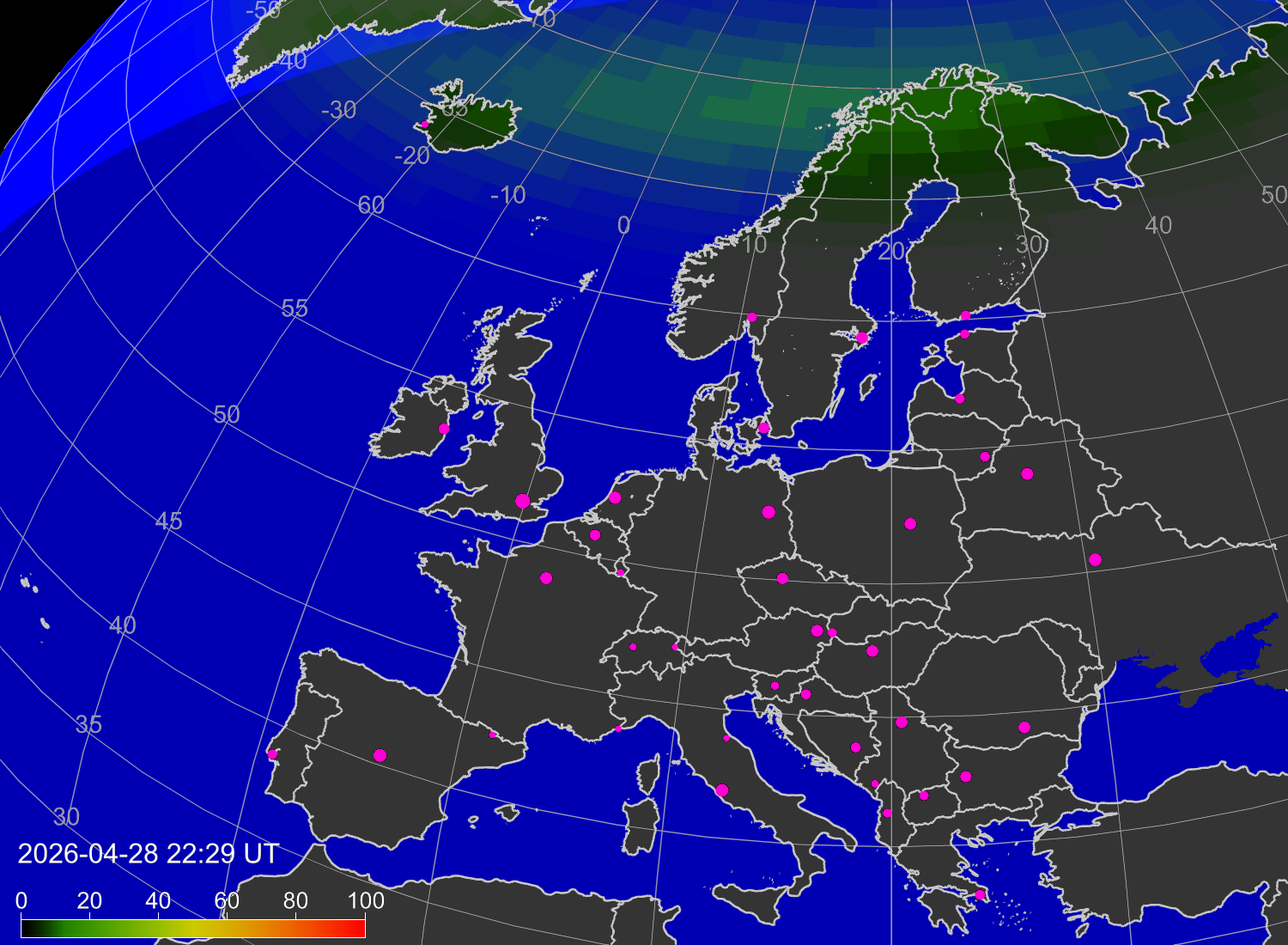Probability of northern lights (auroras) in cities of Europe