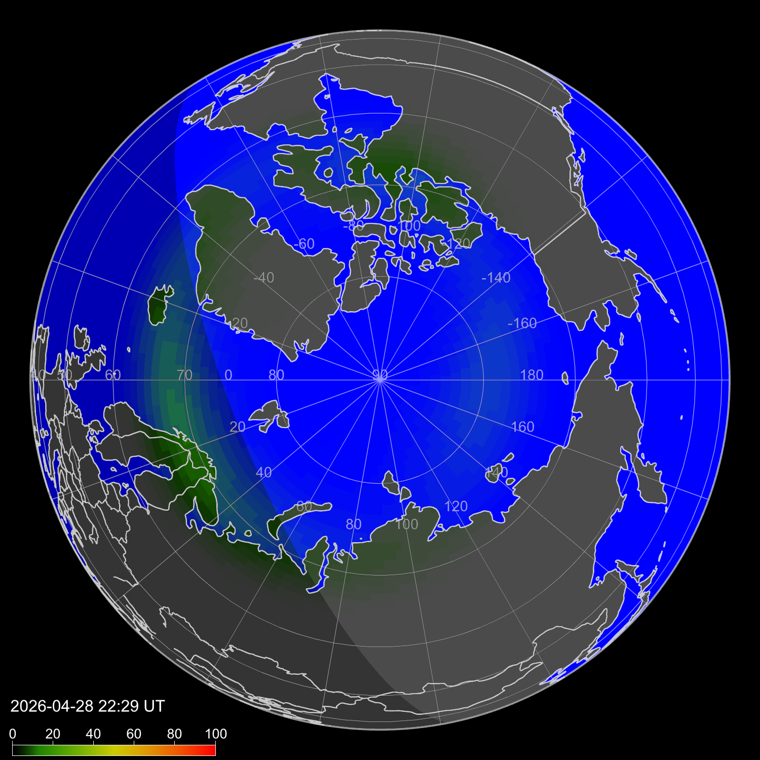 Auroral intensity index and theoretically possible latitude of observations for nighttime in the Estern Hemisphere