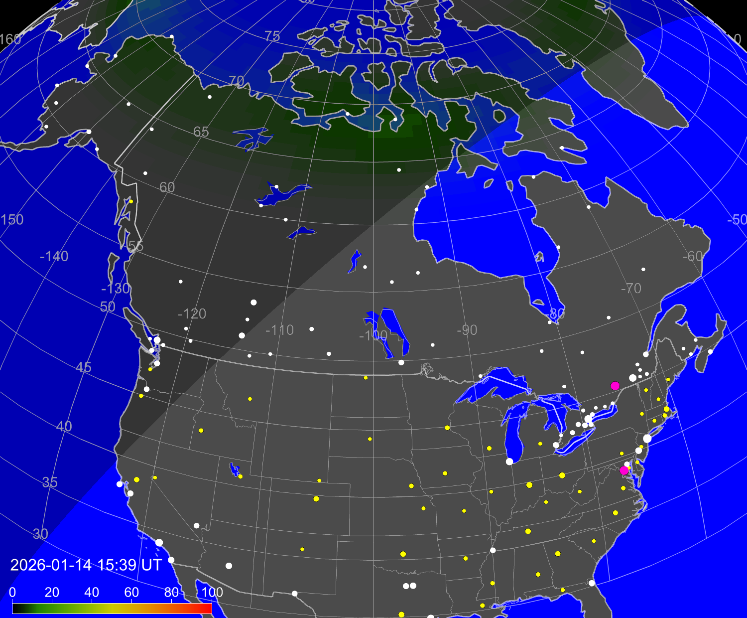 Вероятность полярных сияний в городах Канады