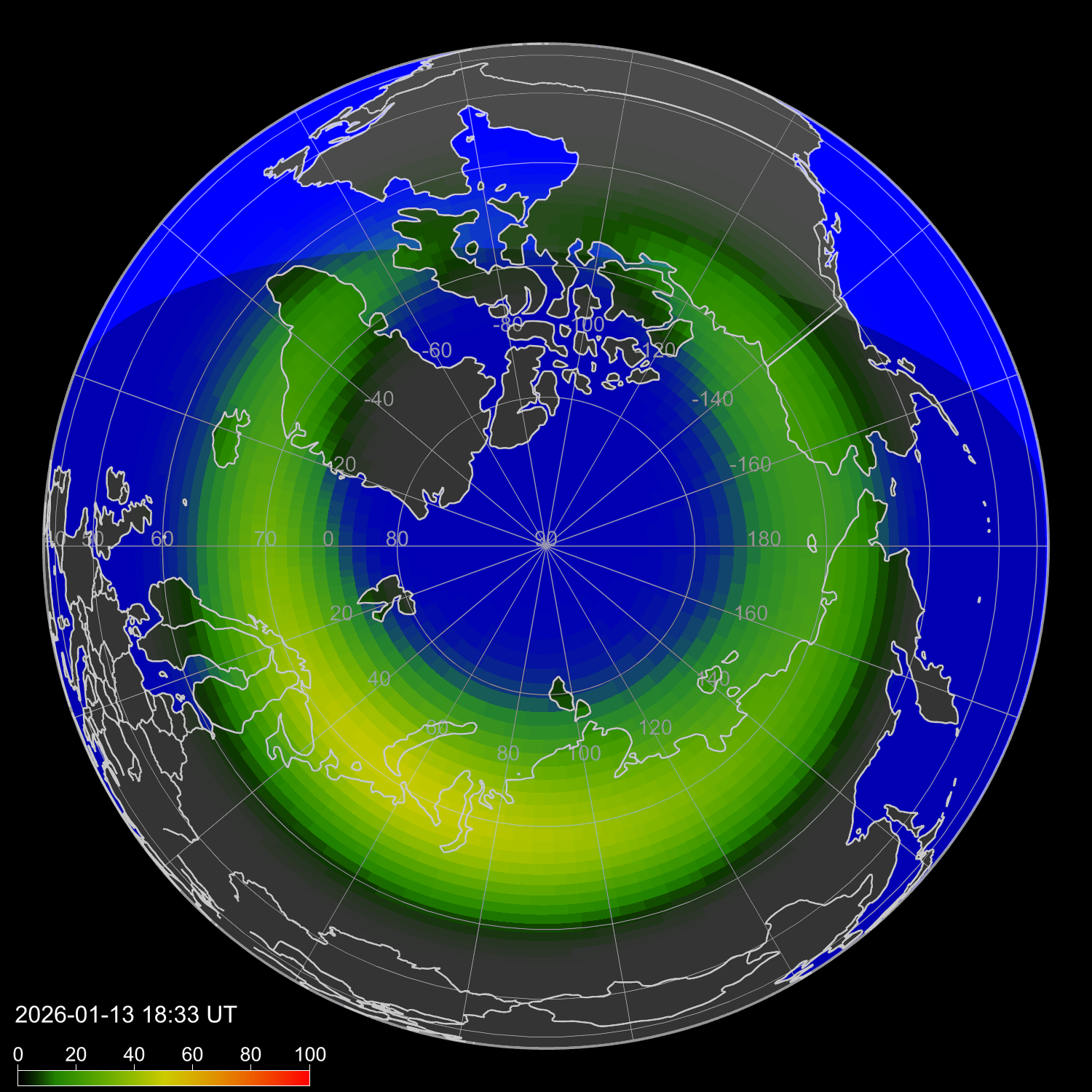 Индекс интенсивности полярных сияний и теоретически возможная широта наблюдений для ночного времени в западном полушарии