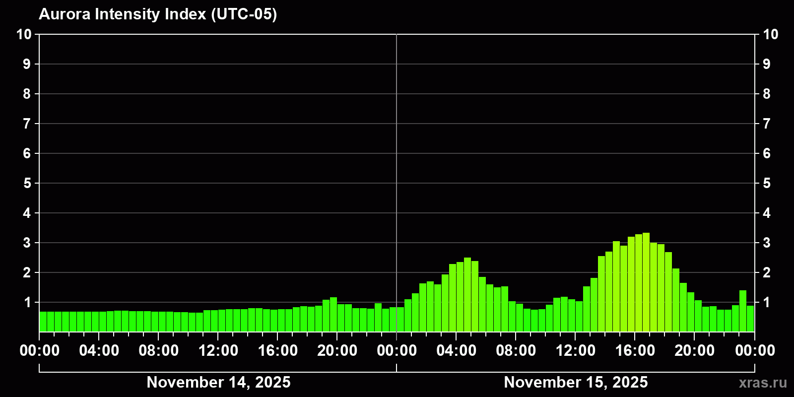 Changes in the auroral intensity index from 2025-11-14 to 2025-11-15 local time