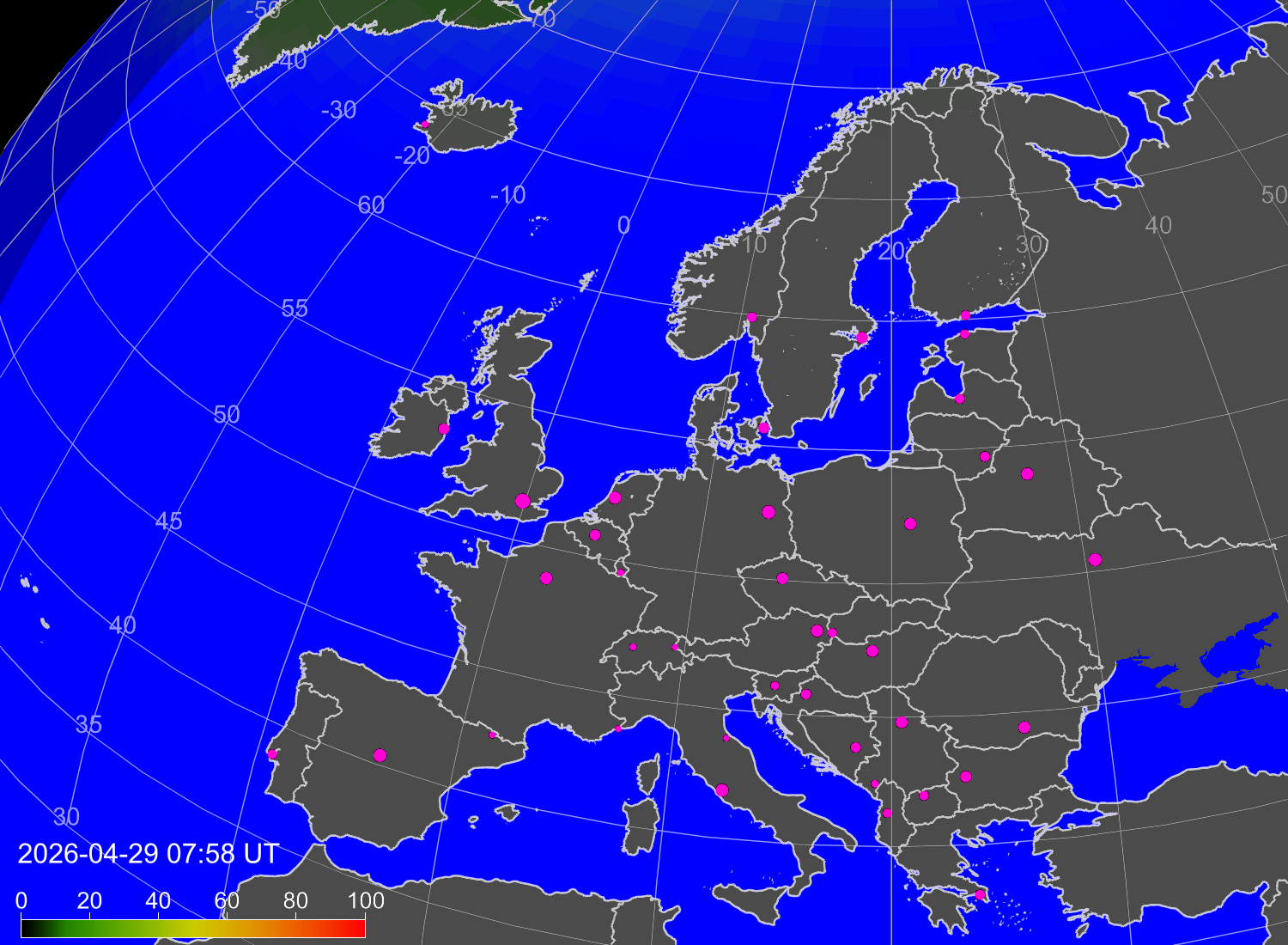 Probability of northern lights (auroras) in cities of Europe