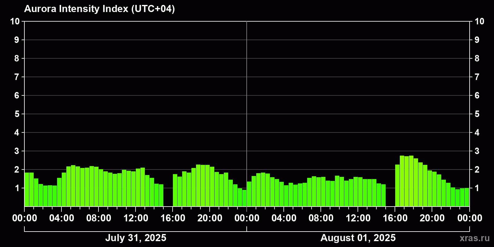 Auroral intensity index and the theoretically possible latitude of observations for nighttime in the Estern Hemisphere as of 2025-08-01 23:50 (end of day) local time