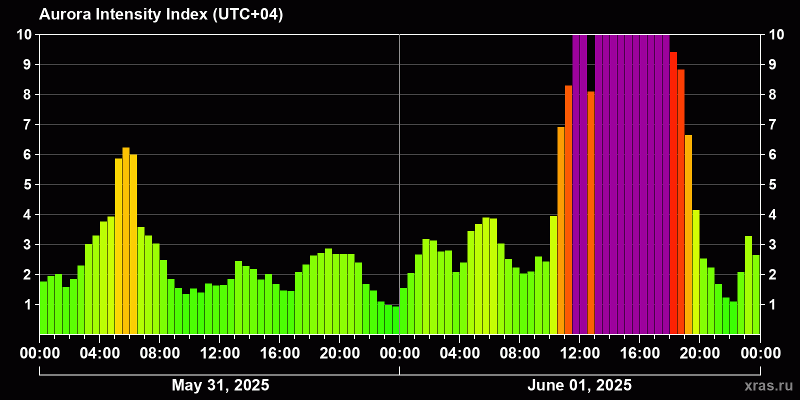 Changes in the auroral intensity index from 2025-05-31 to 2025-06-01 local time