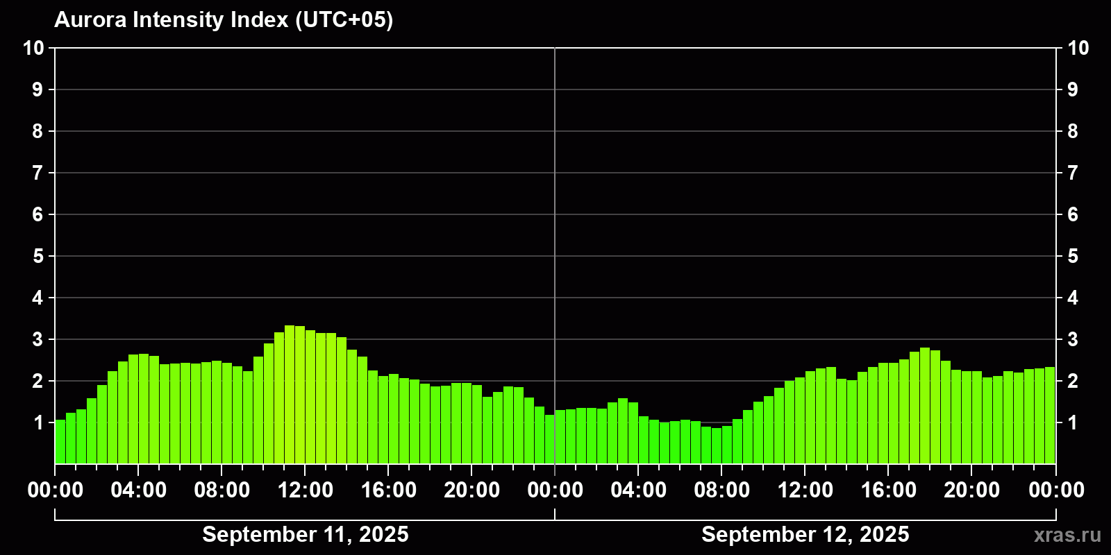 Auroral intensity index and the theoretically possible latitude of observations for nighttime in the Estern Hemisphere as of 2025-09-12 23:57 (end of day) local time
