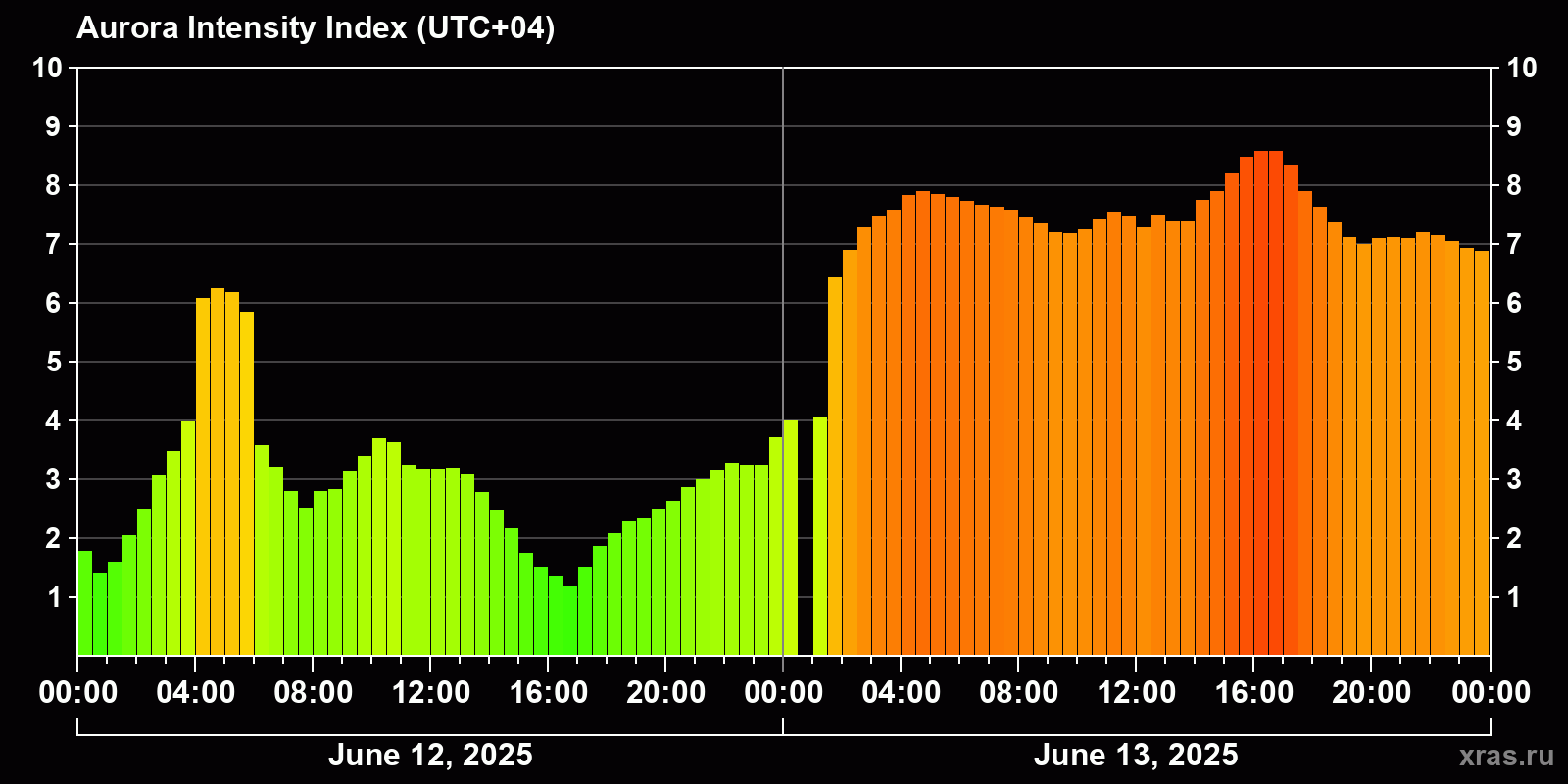 Changes in the auroral intensity index from 2025-06-12 to 2025-06-13 local time