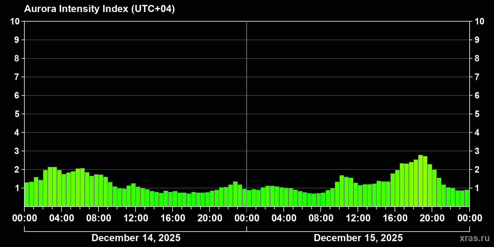 Auroral intensity index and the theoretically possible latitude of observations for nighttime in the Estern Hemisphere as of 2025-12-15 23:45 (end of day) local time
