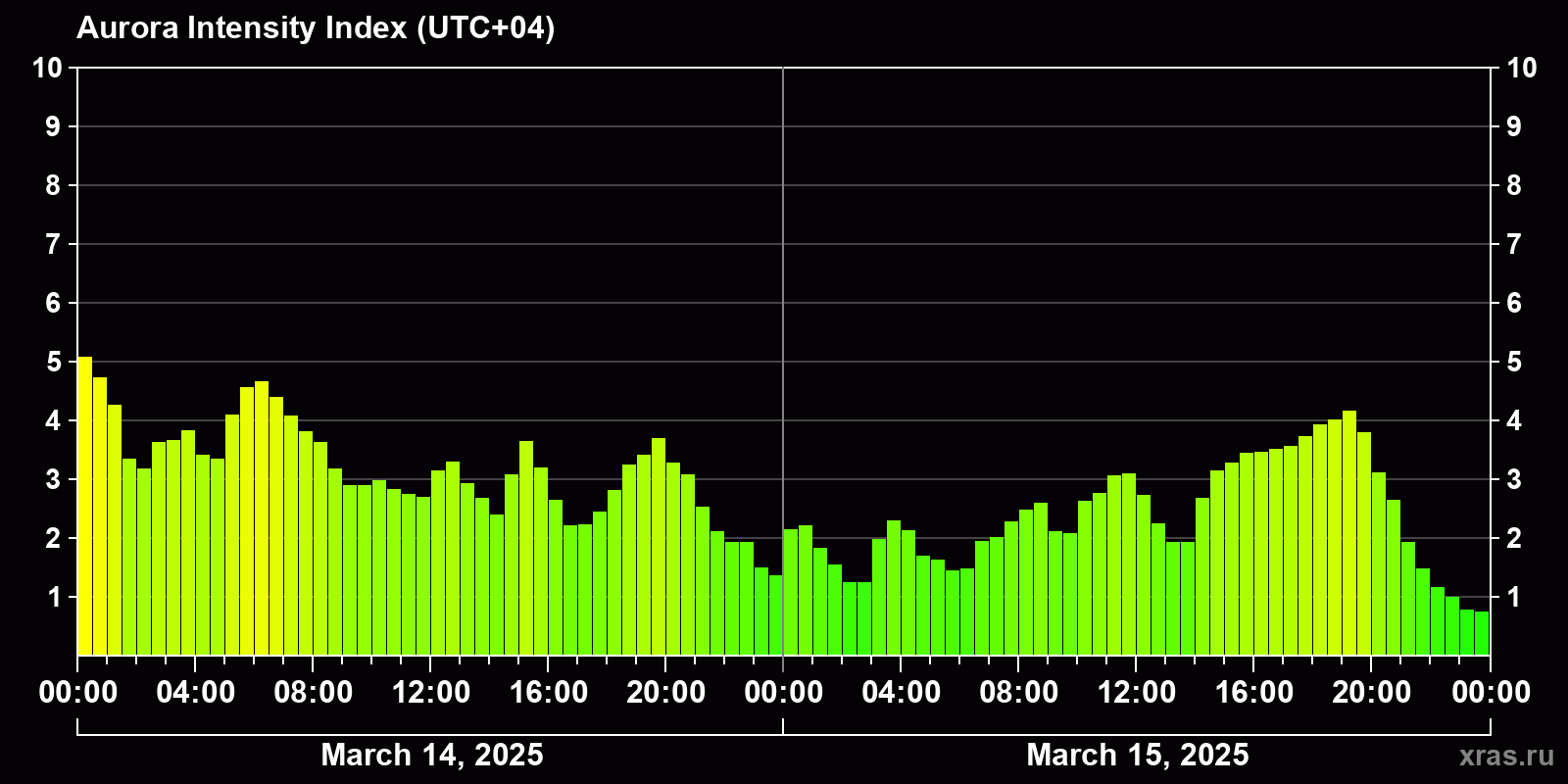 Auroral intensity index and the theoretically possible latitude of observations for nighttime in the Estern Hemisphere as of 2025-03-15 23:52 (end of day) local time