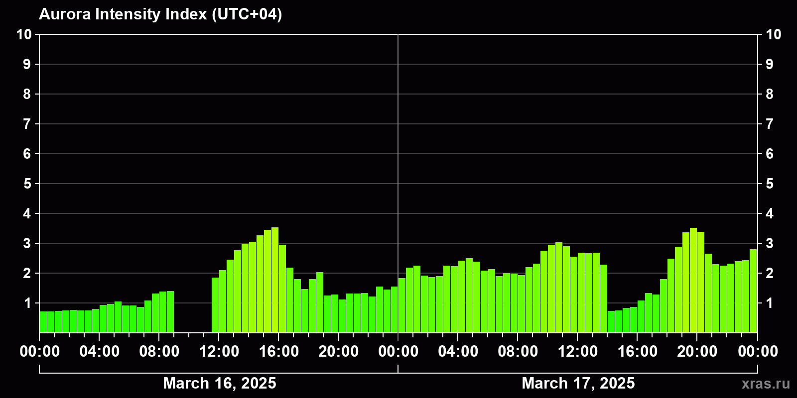 Auroral intensity index and the theoretically possible latitude of observations for nighttime in the Estern Hemisphere as of 2025-03-17 23:51 (end of day) local time