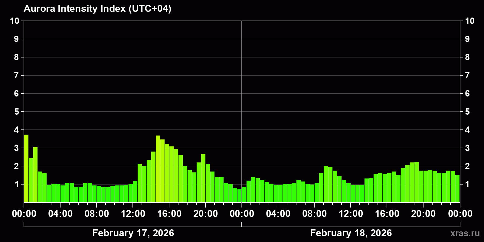Auroral intensity index and the theoretically possible latitude of observations for nighttime in the Estern Hemisphere as of 2026-02-18 23:57 (end of day) local time
