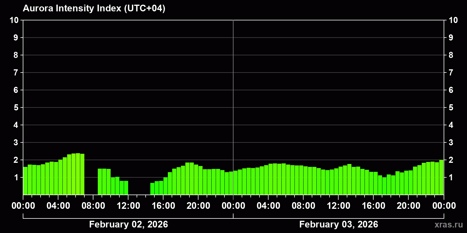 Changes in the auroral intensity index from 2026-02-02 to 2026-02-03 local time