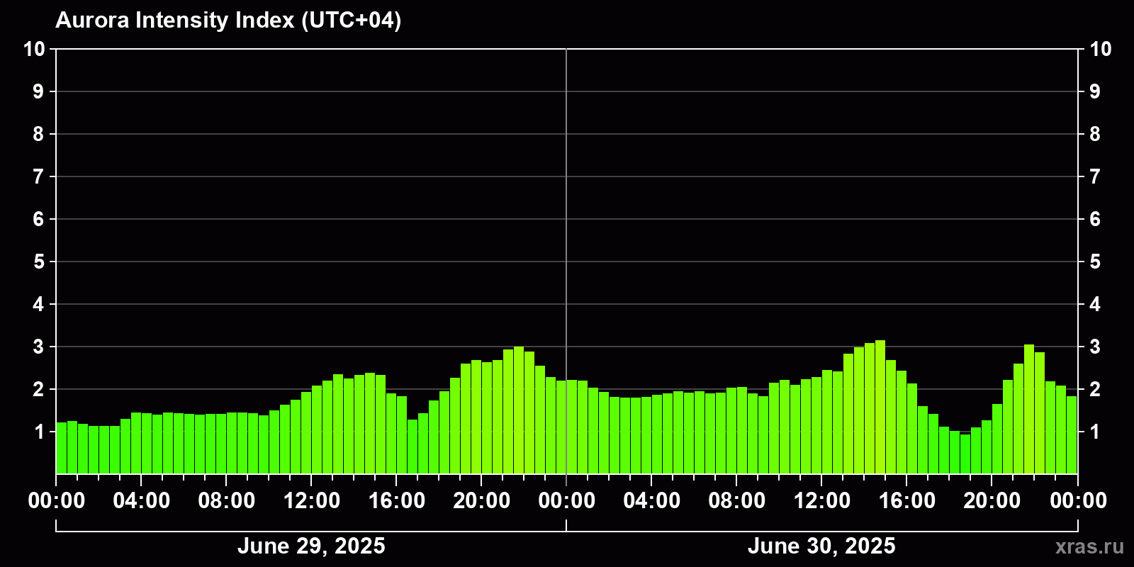 Auroral intensity index and the theoretically possible latitude of observations for nighttime in the Estern Hemisphere as of 2025-06-30 23:45 (end of day) local time
