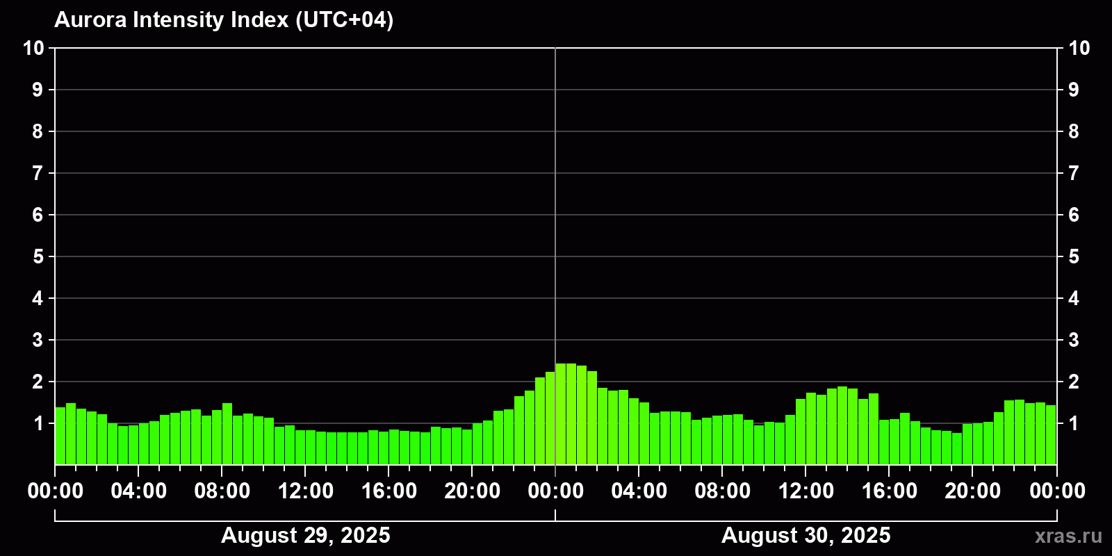 Changes in the auroral intensity index from 2025-08-29 to 2025-08-30 local time