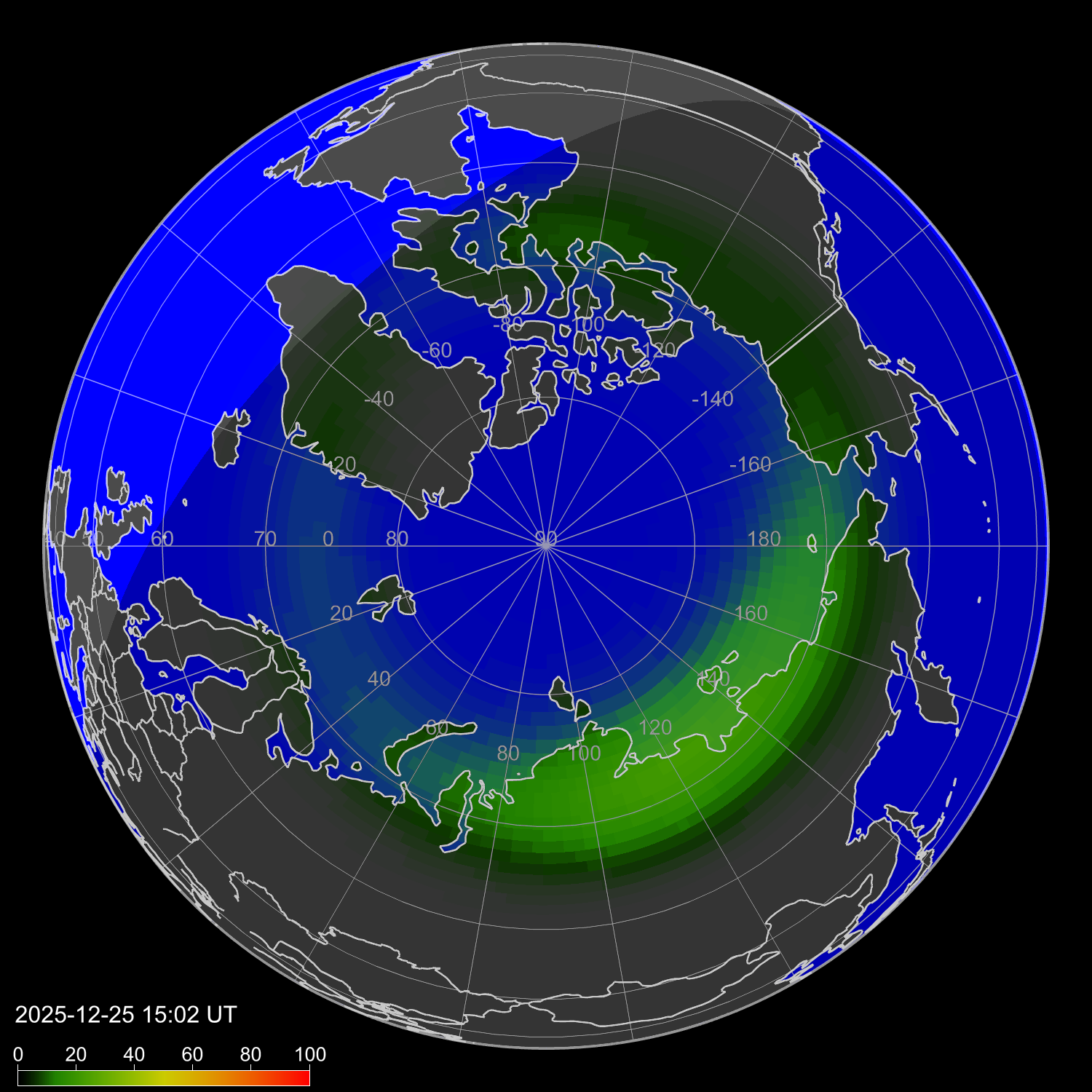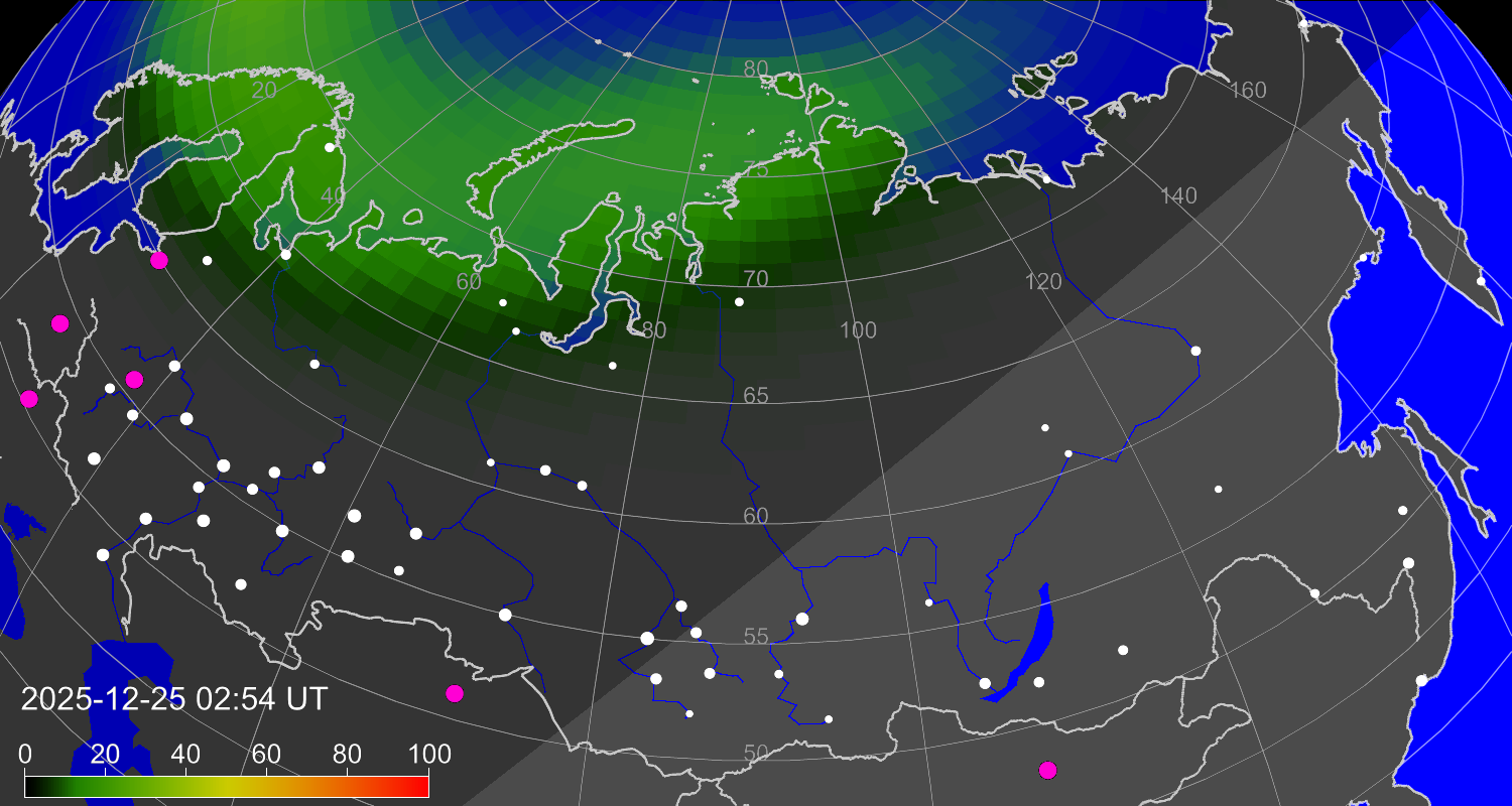 Изменения и часовой прогноз индекса интенсивности полярных сияний с 2025-12-24 по 2025-12-25