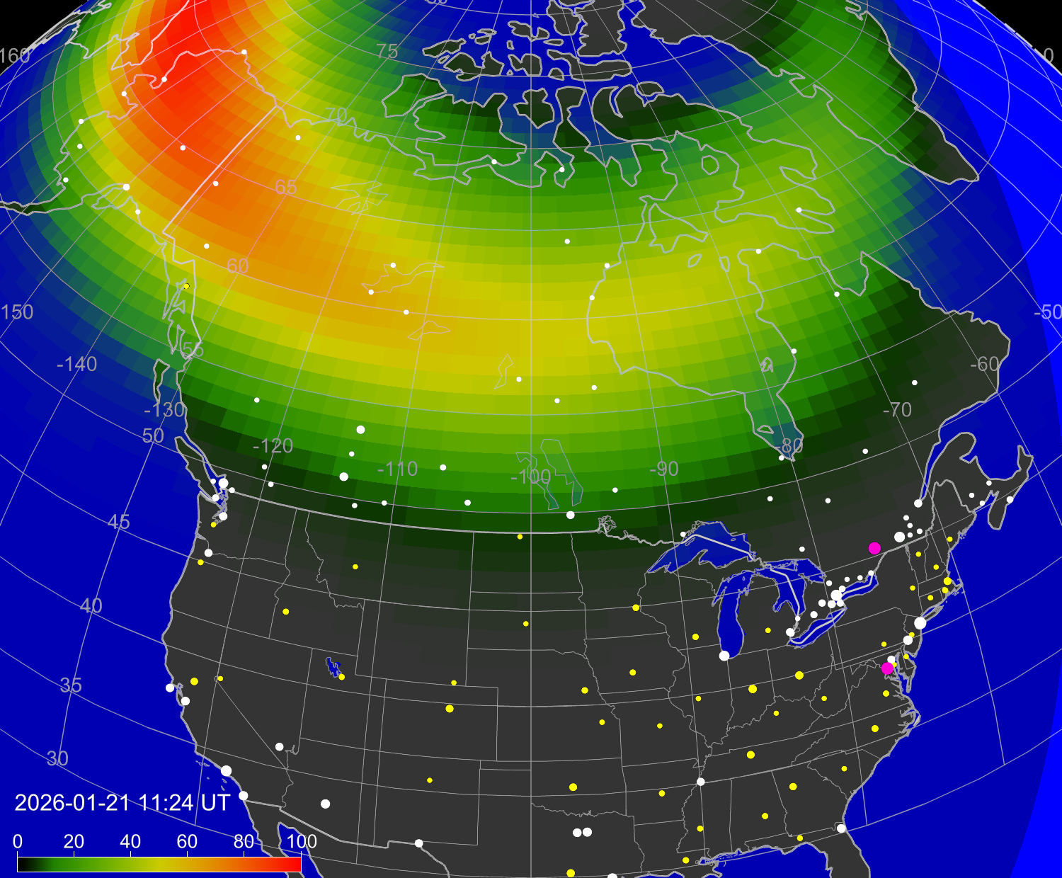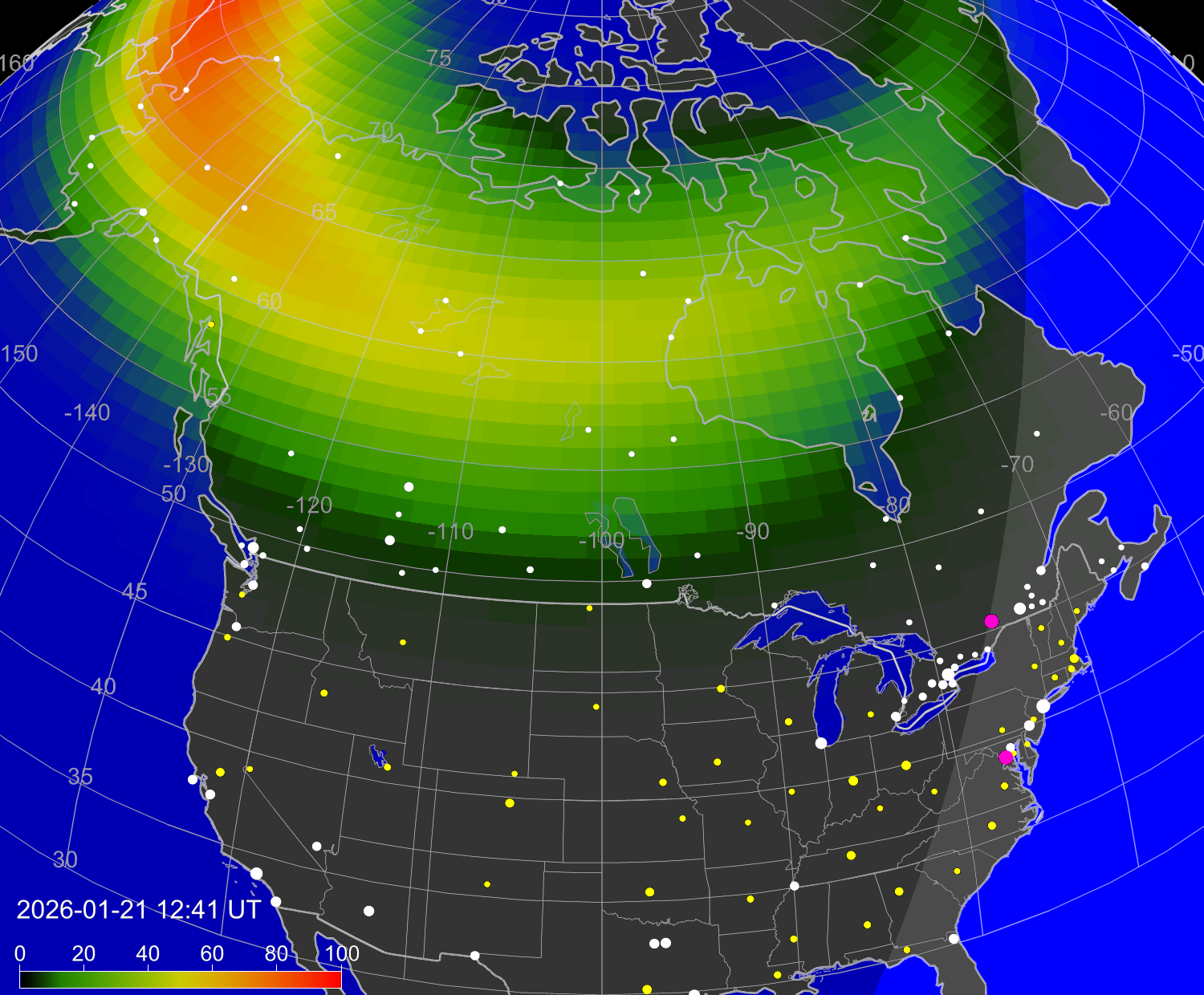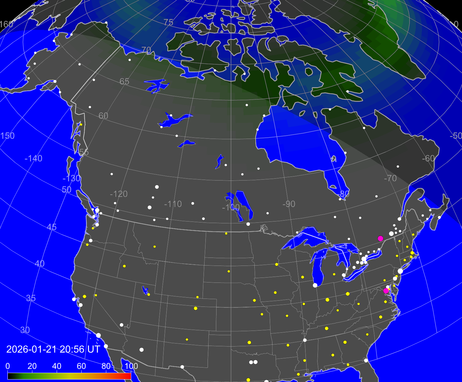 Вероятность полярных сияний в городах Канады
