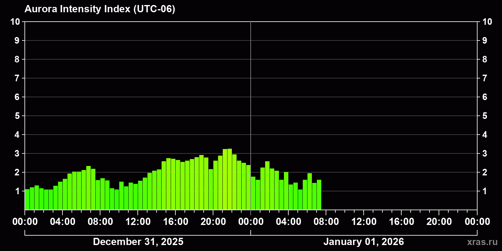 Auroral intensity index and the theoretically possible latitude of observations for nighttime in the Western Hemisphere as of 2026-01-01 05:07 (end of day) local time