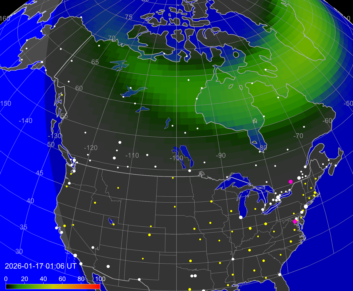 Вероятность полярных сияний в городах Канады
