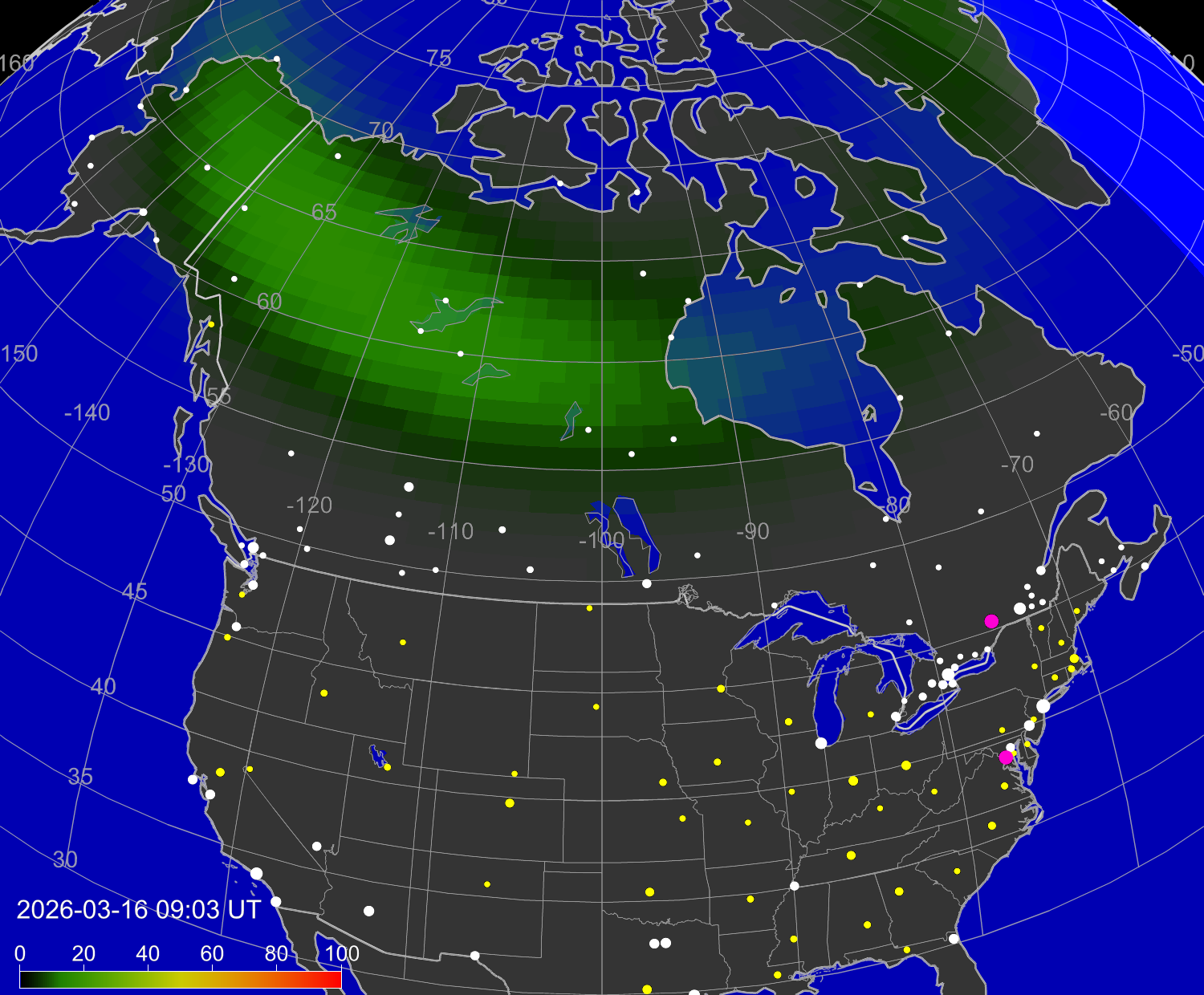 Изменения и часовой прогноз индекса интенсивности полярных сияний с 2026-03-14 по 2026-03-15