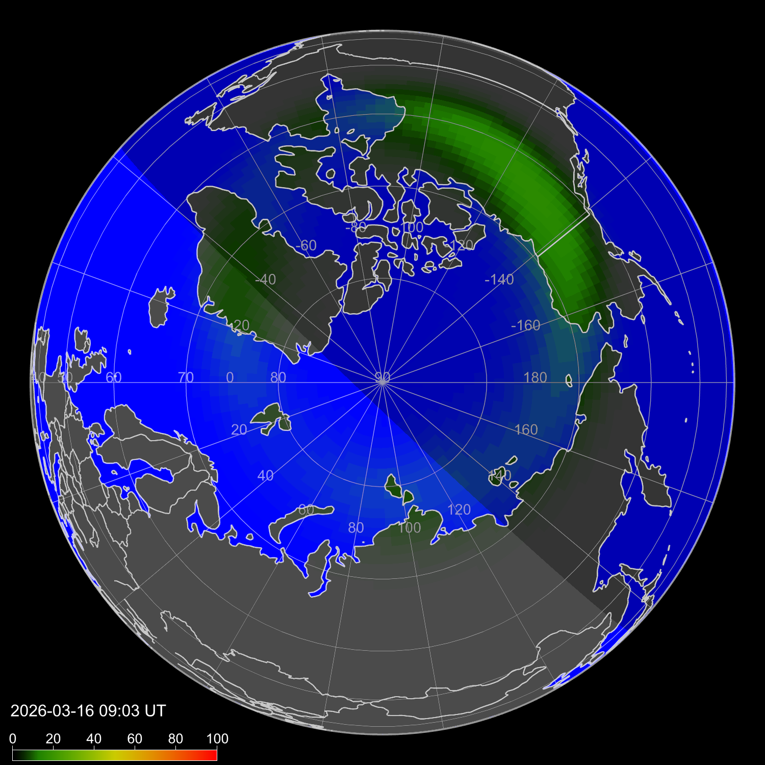 Индекс интенсивности полярных сияний и теоретически возможная широта наблюдений для ночного времени в западном полушарии