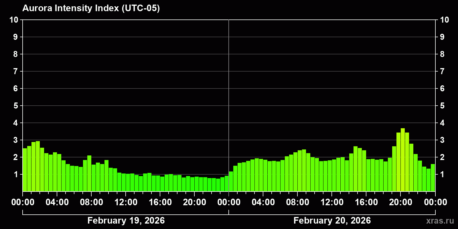 Auroral intensity index and the theoretically possible latitude of observations for nighttime in the Western Hemisphere as of 2026-02-20 23:54 (end of day) local time