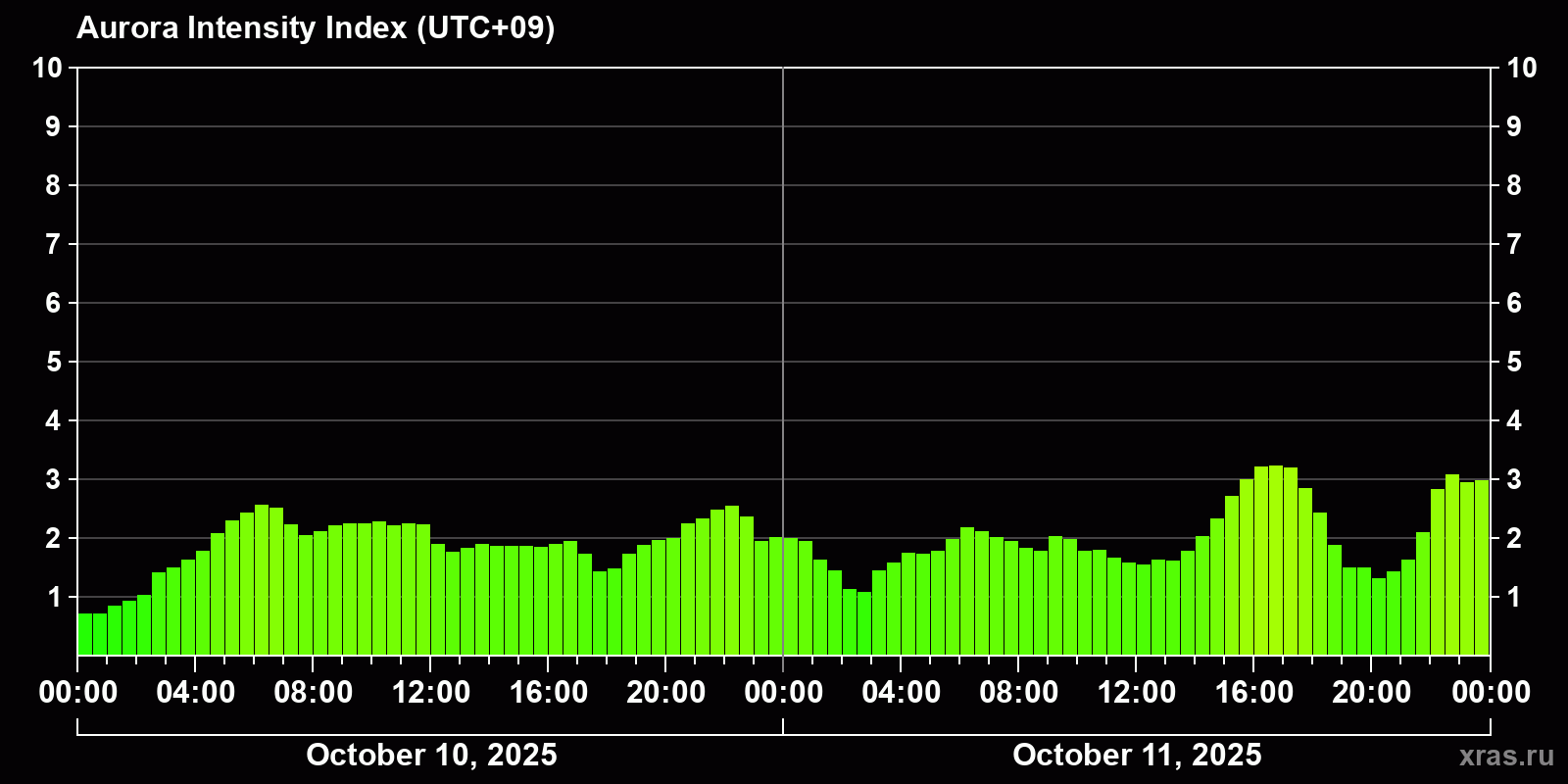 Changes in the auroral intensity index from 2025-10-10 to 2025-10-11 local time