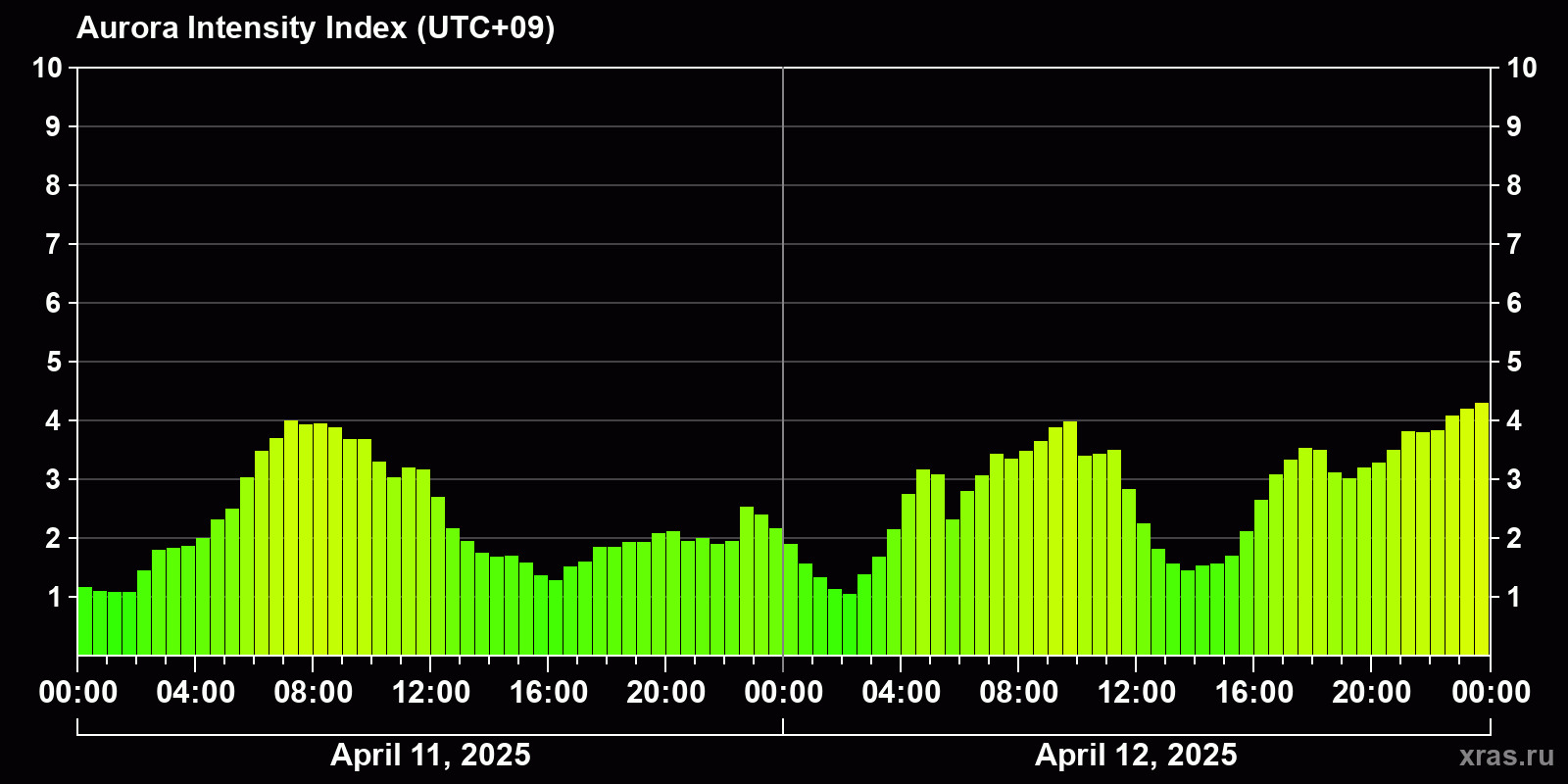 Changes in the auroral intensity index from 2025-04-11 to 2025-04-12 local time