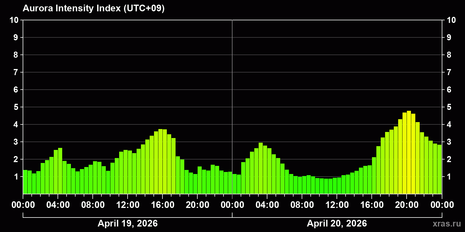 Changes in the auroral intensity index from 2026-04-19 to 2026-04-20 local time