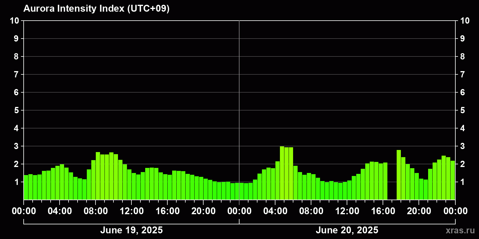 Changes in the auroral intensity index from 2025-06-19 to 2025-06-20 local time