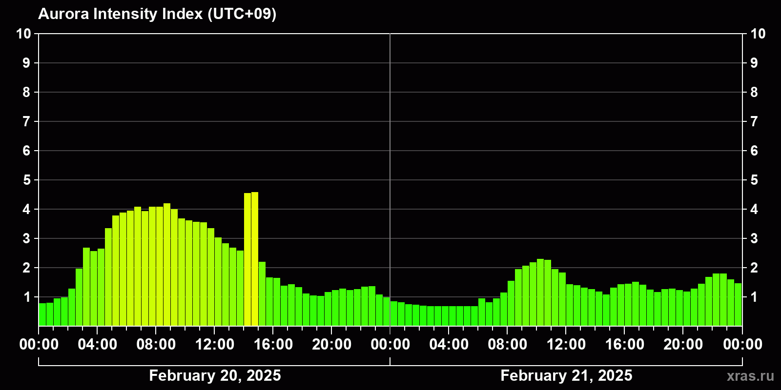 Changes in the auroral intensity index from 2025-02-20 to 2025-02-21 local time