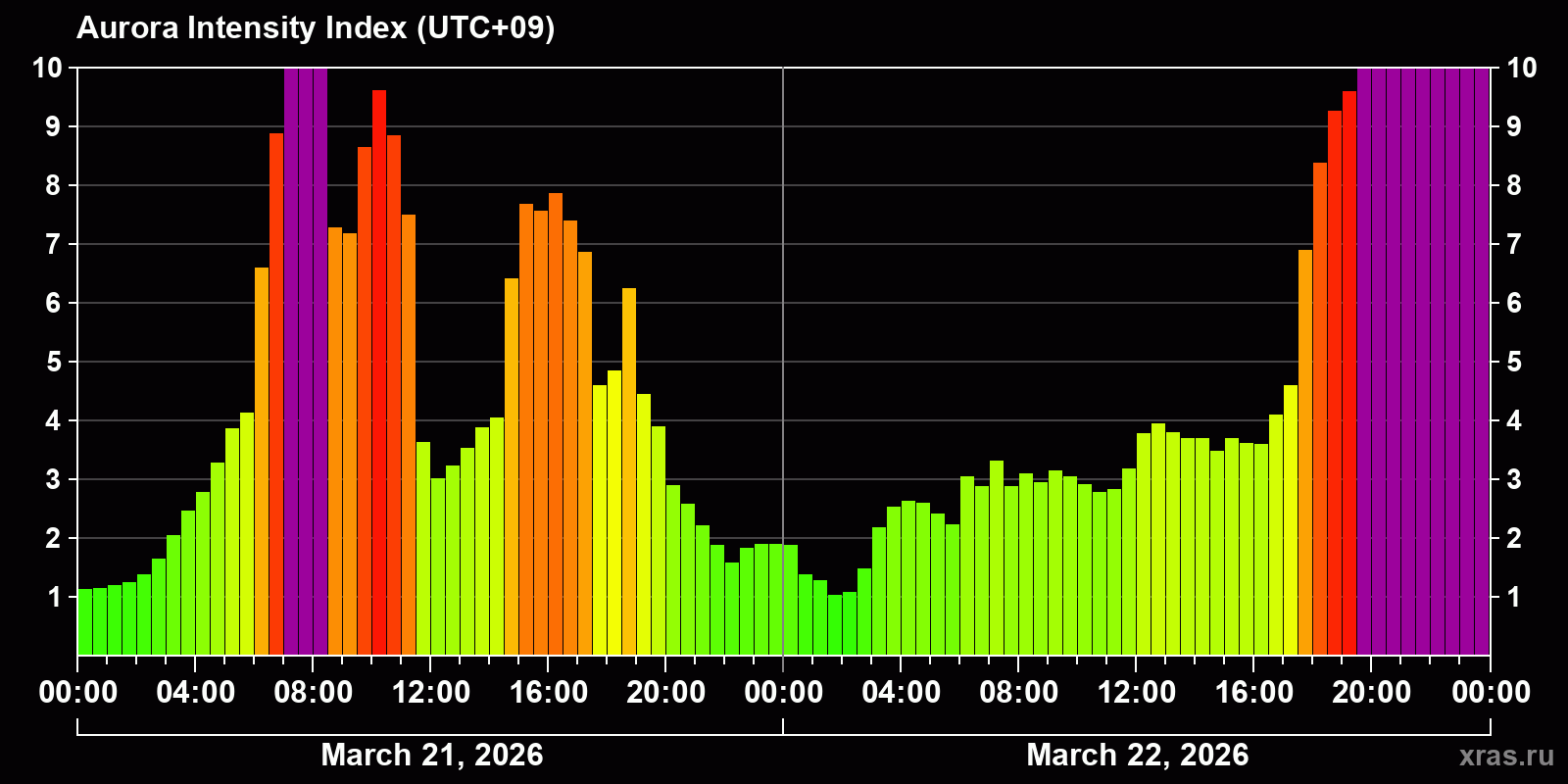 Changes in the auroral intensity index from 2026-03-21 to 2026-03-22 local time