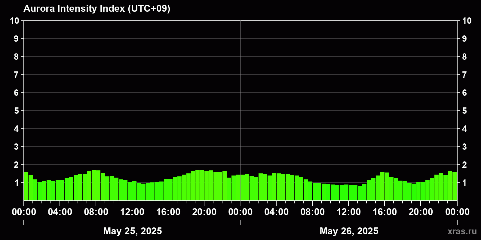 Auroral intensity index and the theoretically possible latitude of observations for nighttime in the Estern Hemisphere as of 2025-05-26 23:53 (end of day) local time