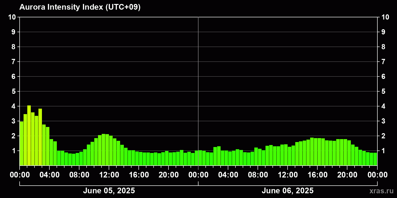 Auroral intensity index and the theoretically possible latitude of observations for nighttime in the Estern Hemisphere as of 2025-06-06 23:54 (end of day) local time