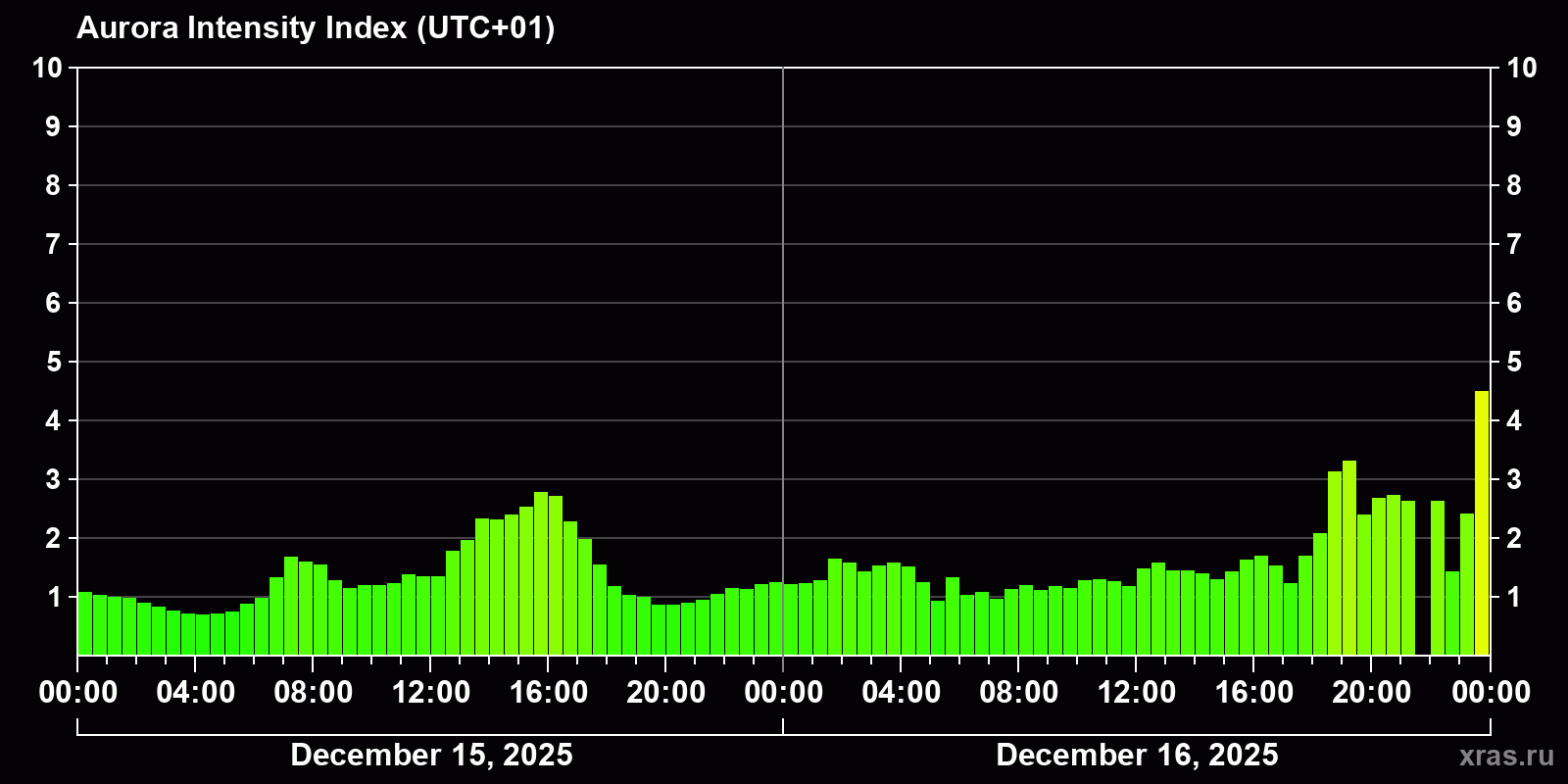 Auroral intensity index and the theoretically possible latitude of observations for nighttime in the Estern Hemisphere as of 2025-12-16 23:50 (end of day) local time