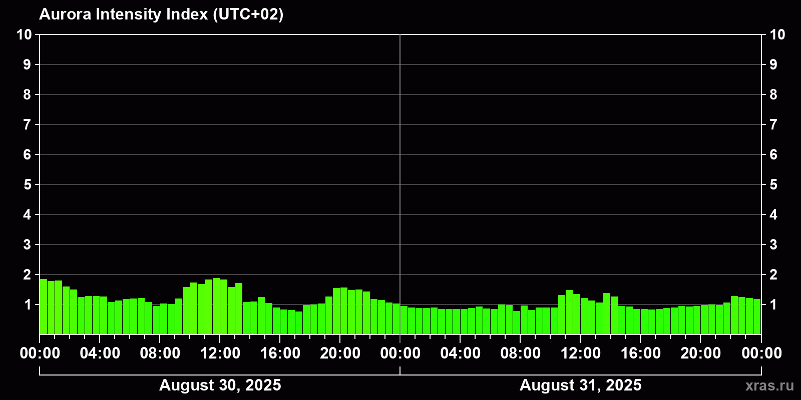 Auroral intensity index and the theoretically possible latitude of observations for nighttime in the Estern Hemisphere as of 2025-08-31 23:57 (end of day) local time