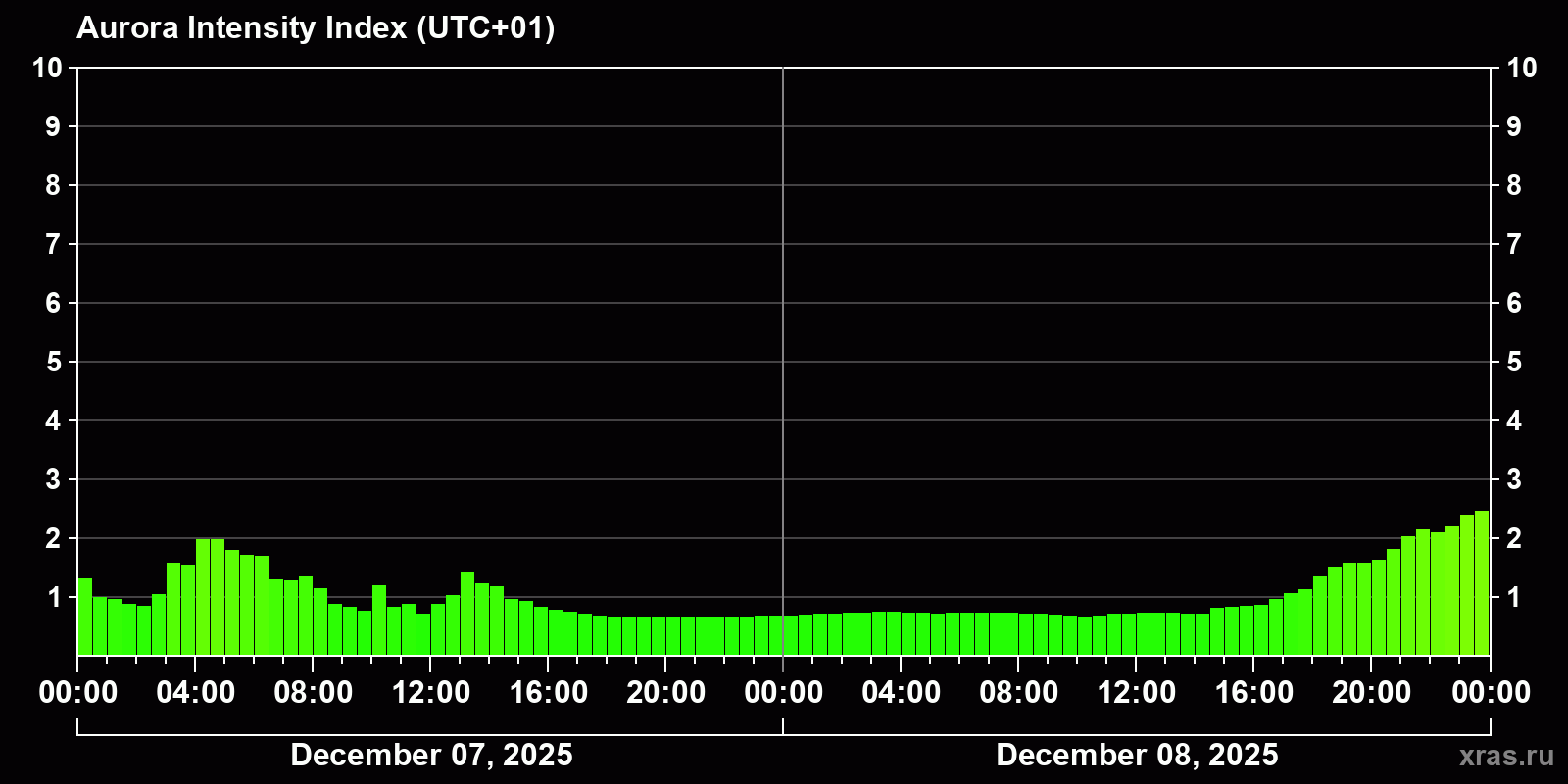 Auroral intensity index and the theoretically possible latitude of observations for nighttime in the Estern Hemisphere as of 2025-12-08 23:55 (end of day) local time
