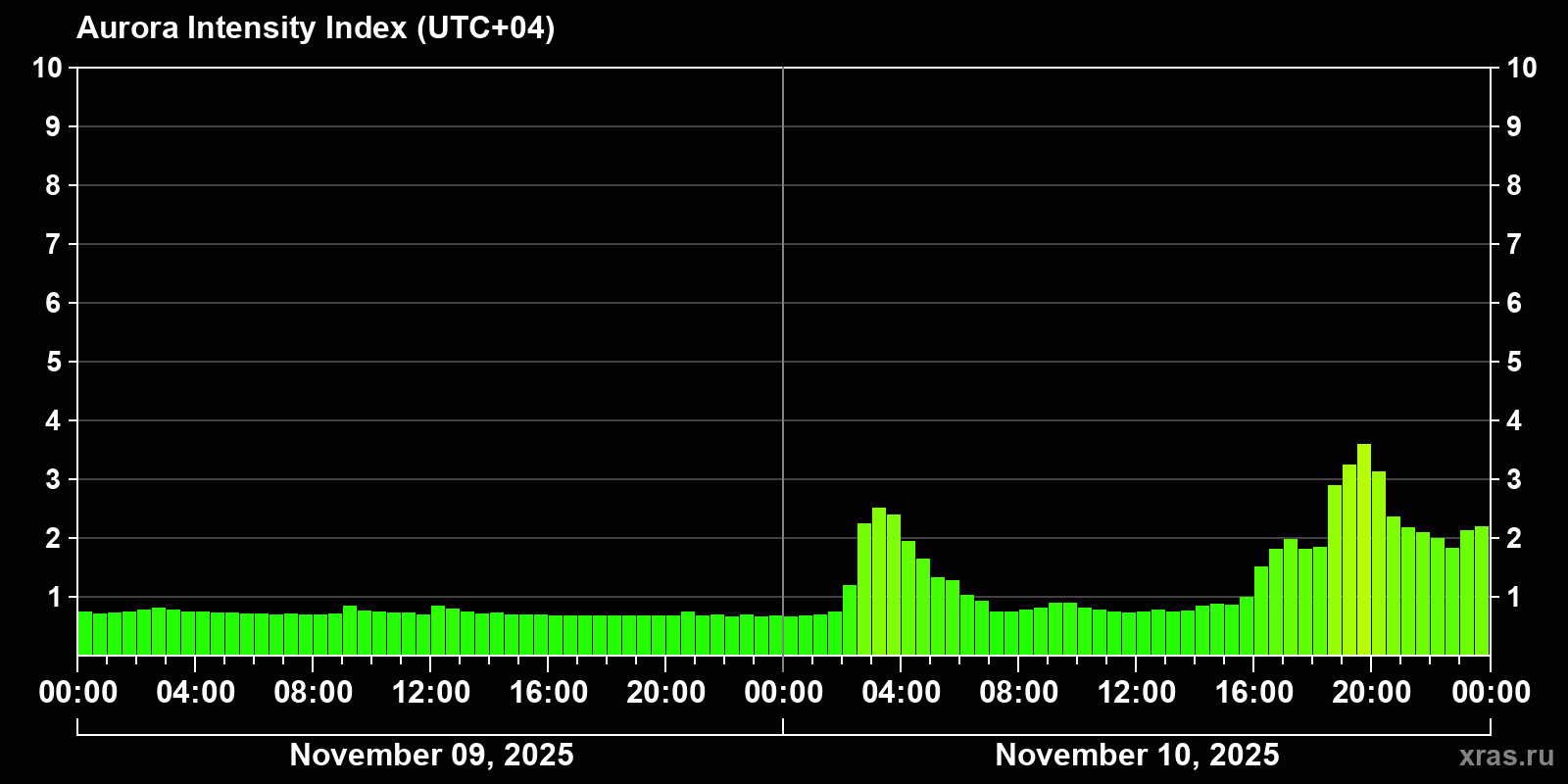 Auroral intensity index and the theoretically possible latitude of observations for nighttime in the Estern Hemisphere as of 2025-11-10 23:44 (end of day) local time
