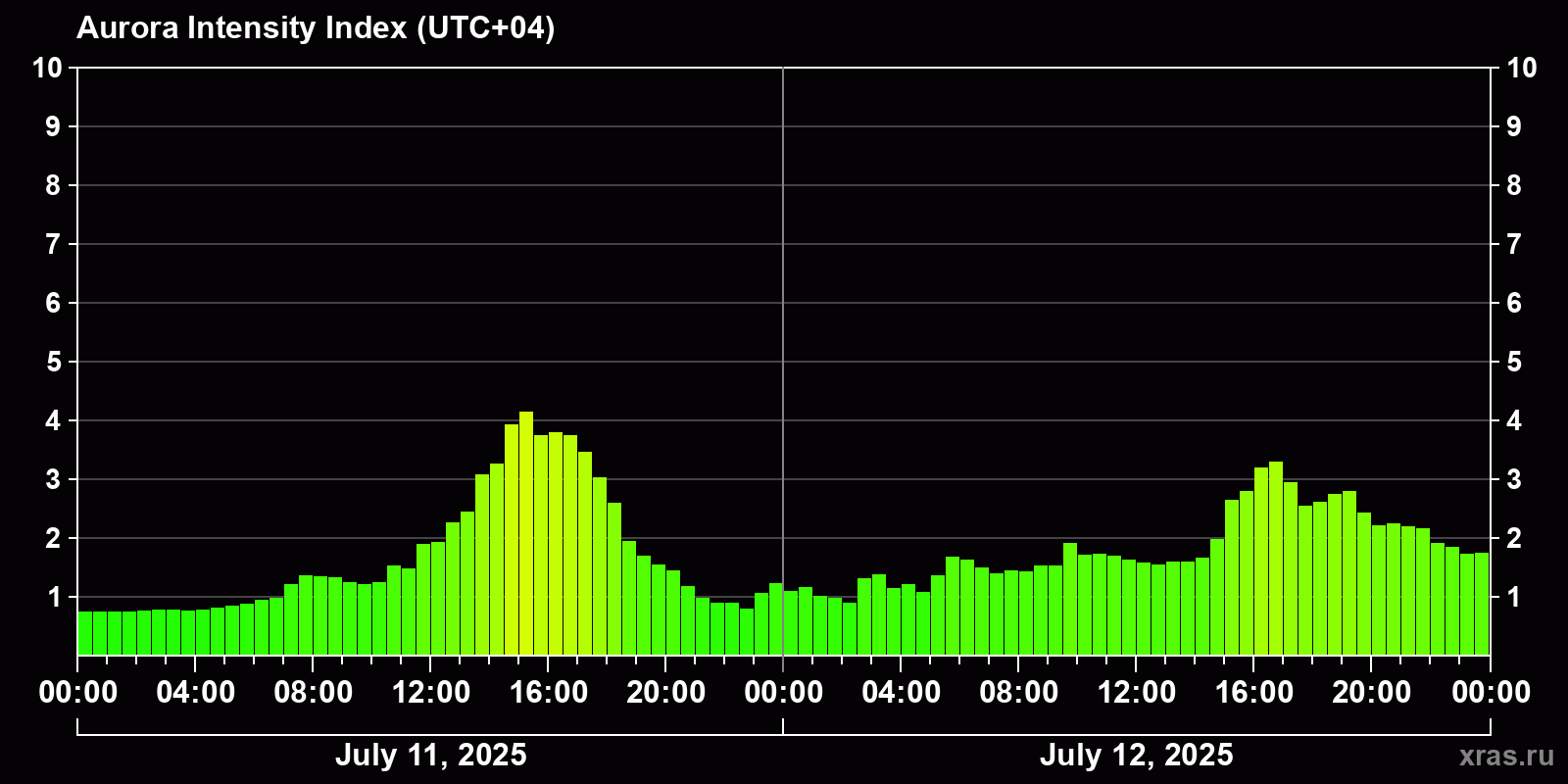 Changes in the auroral intensity index from 2025-07-11 to 2025-07-12 local time