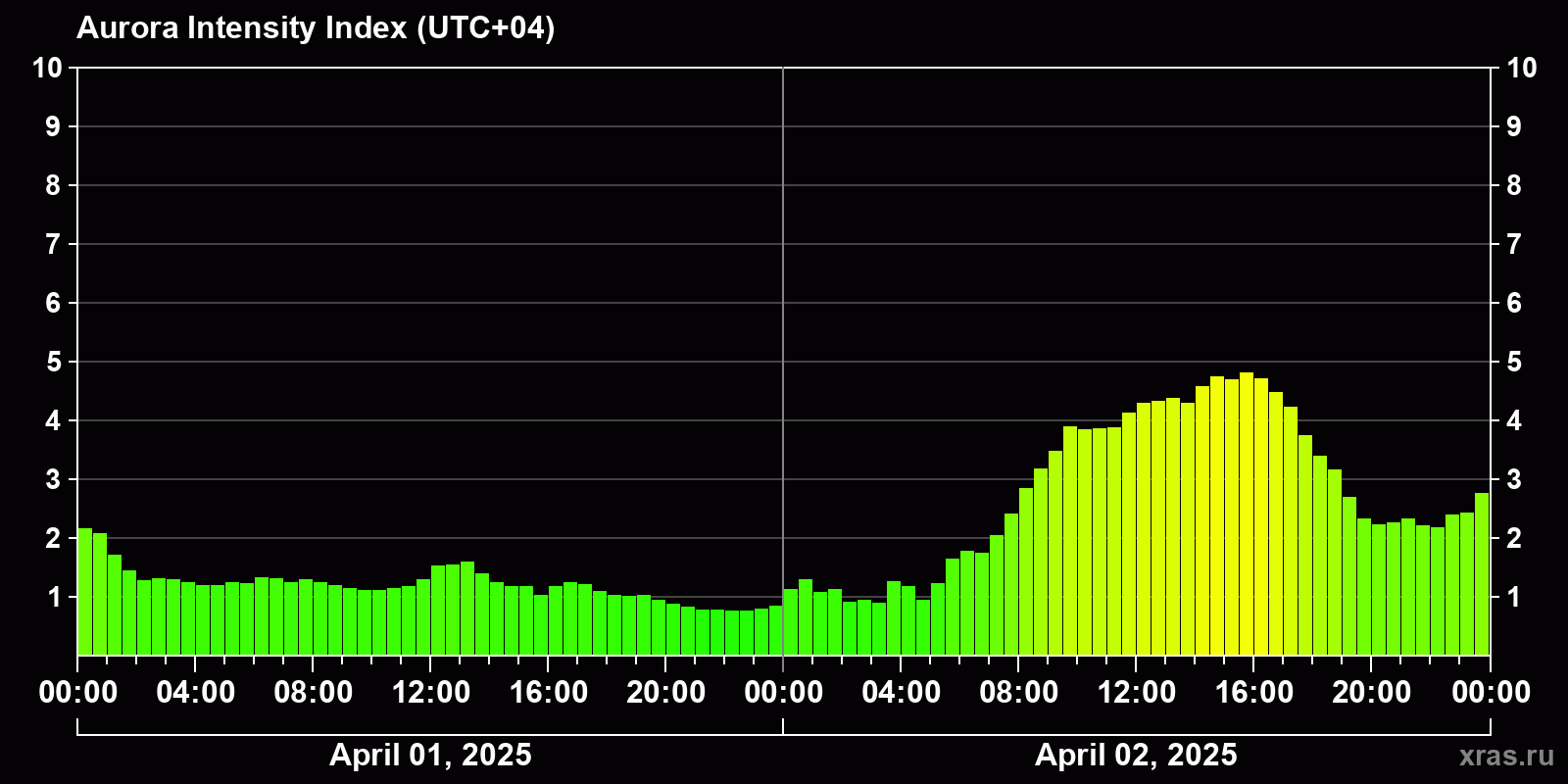 Auroral intensity index and the theoretically possible latitude of observations for nighttime in the Estern Hemisphere as of 2025-04-02 23:51 (end of day) local time